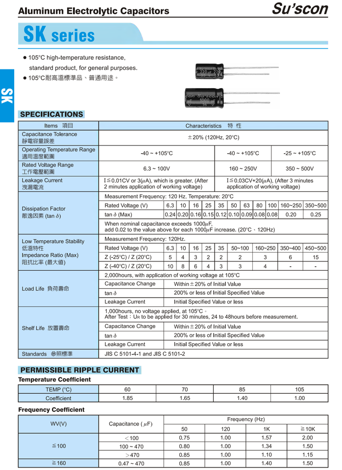 SK100M102K40SR Su'scon 1000uF 100V 1840mm Aluminum Electrolytic Radial Capacitor 2000h 105C LS:7.5mm