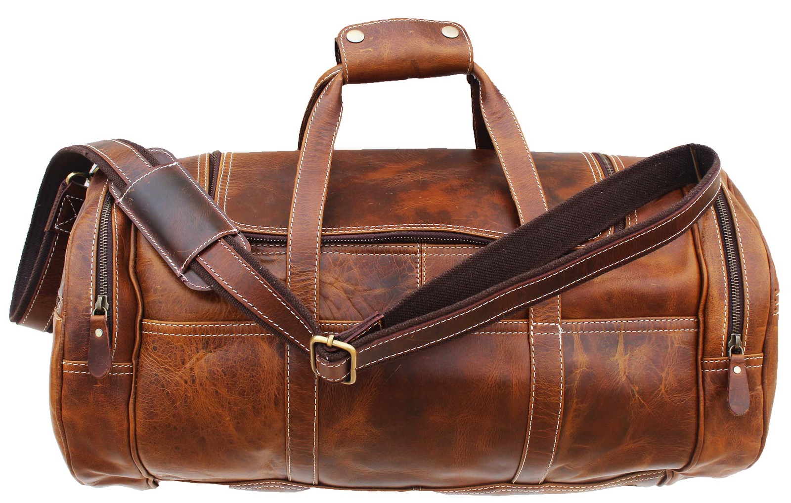 Challenger sturdy versatile duffle bag hand crafted from top quality full-grain cow leather and lined with high quality canvas by artisans who have been working with leather for decades. The distressed leather and antique brass hardware gives this bag a classy vintage look. This multipurpose bag is the perfect choice for travel, gym/fitness, or weekend trips. Conveniently sized roomy bag fits most airline overhead bins. Includes a removable, and adjustable nylon reinforced shoulder strap. Main compartment has a full zipper closure with a wide opening to easily access your belongings. The interior also features dual side zippered pockets. On the exterior you have two additional zippered pockets at each end of bag, and two open pockets at front and back of bag. Bag measures 22" L x 11" W x 11" H providing plenty of room for all of your essentials.