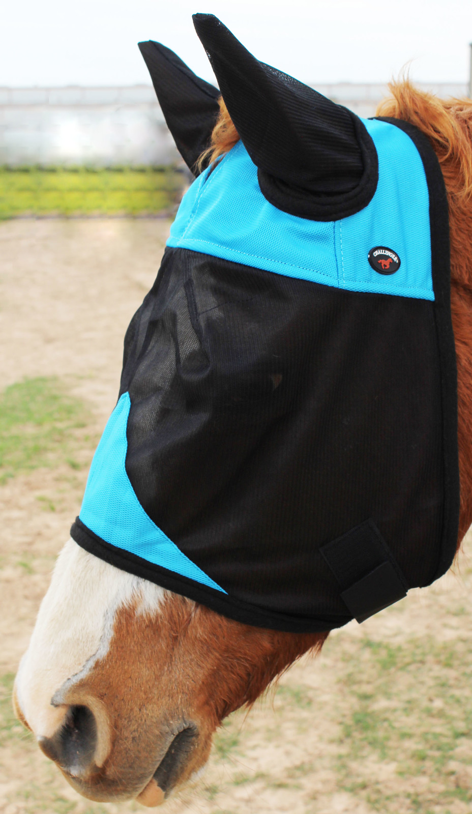 'This Challenger Fly Mask provides great protection, and helps keep pest away from your horse's sensitive face, nose, and ears. Made from soft mesh material to allow for air circulation. Protects from UV rays. Comes with heavy reinforced stitching for durability. Easy to put on and remove. Top brand, top quality, at an affordable price.