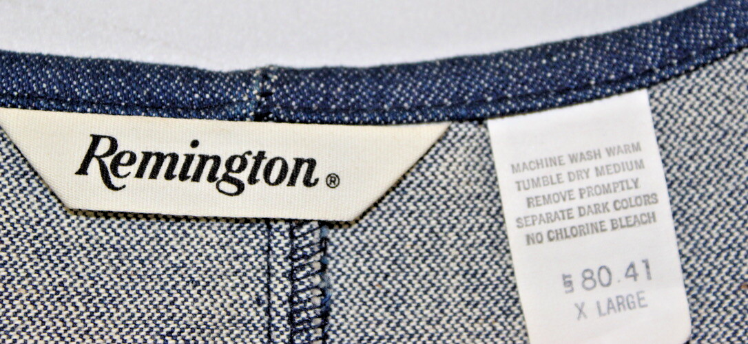 100% blue denim cotton. Snap closures. Label: Remington Sportsman.