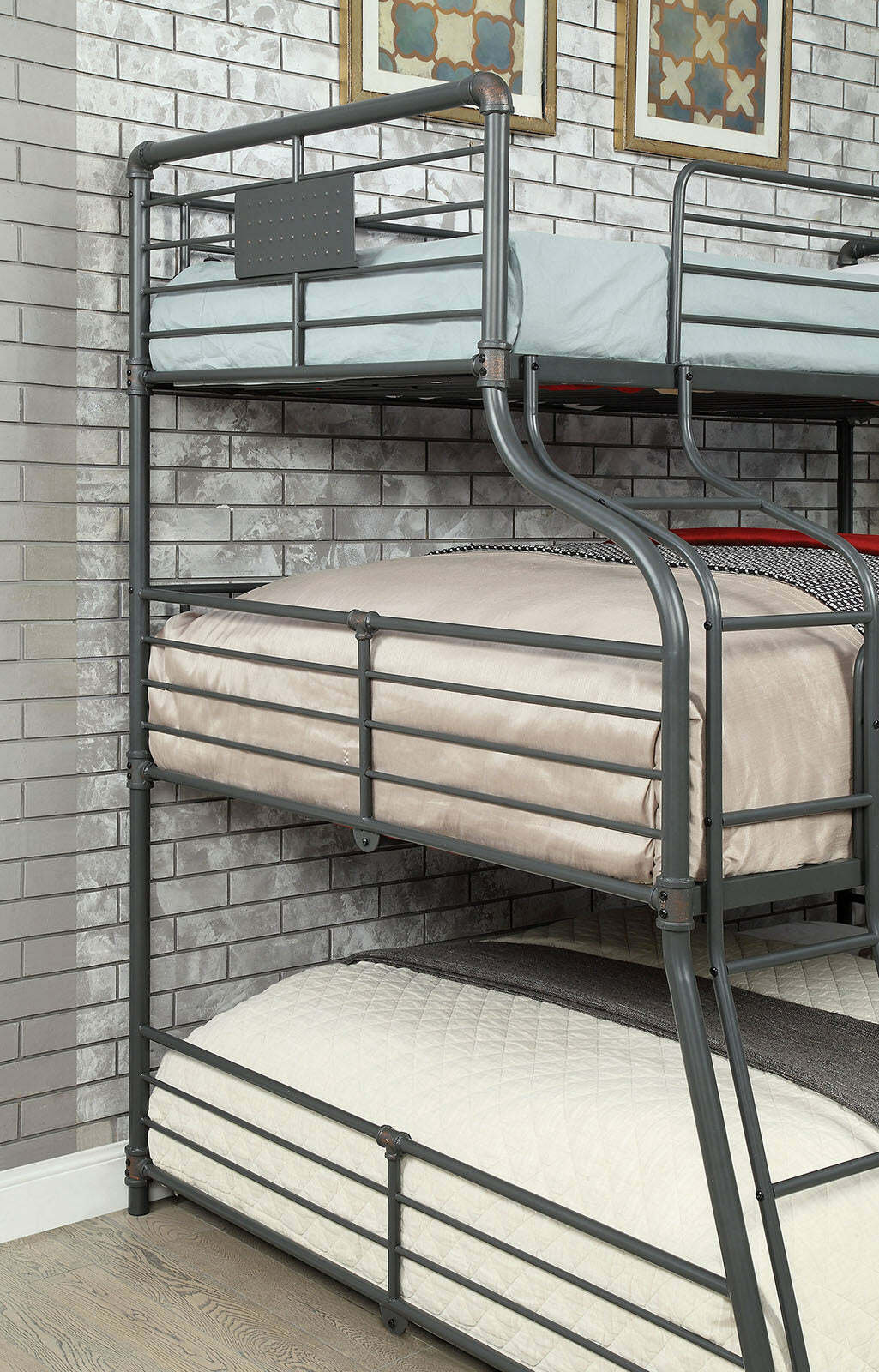 Take it back a few decades with this industrial inspired bunk bed. The visible piping framework is finished in antique black to create an authentic throwback atmosphere. This three tiered bunk has a unique look with its staggered bed sizes and a swooping curved ladder. The twin on-top-of full on-top-of queen size beds can accommodate a variety ages and sizes.