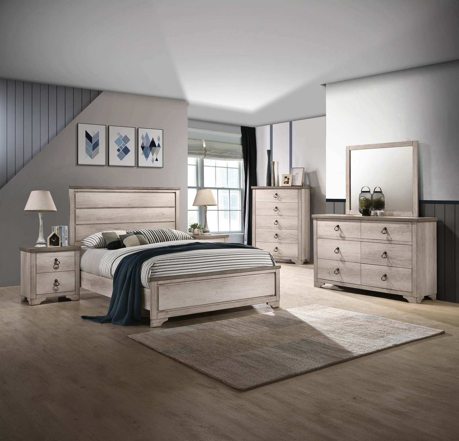Elevate your sleeping quarters with this effortlessly elegant bedroom suite. The charming rustic-chic aesthetic is highlighted by a distressed finish and antique-style drawer pulls, offering a warm, inviting ambiance. The collection includes a stately bed frame that promises restful nights