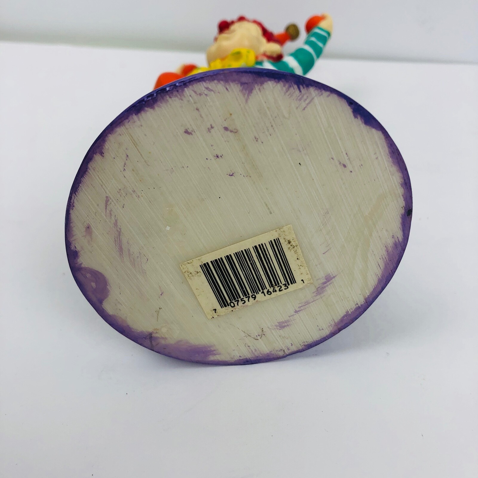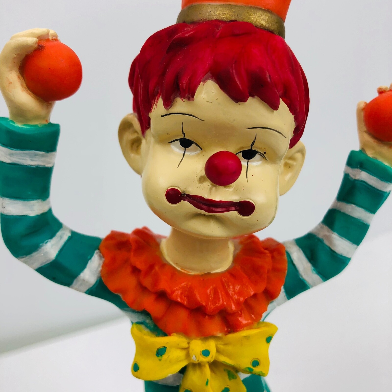This vintage sad clown figurine is a unique and charming addition to any collection. Hand-painted with vibrant orange colors, this ceramic and porcelain sculpture exudes a whimsical circus theme. Standing at 1992, this jester hat and unicycle juggling balls character captures the essence of a late 20th-century clown. The hand-painted finish adds a touch of nostalgia to any room it is displayed in, making it a perfect decor piece for all occasions.