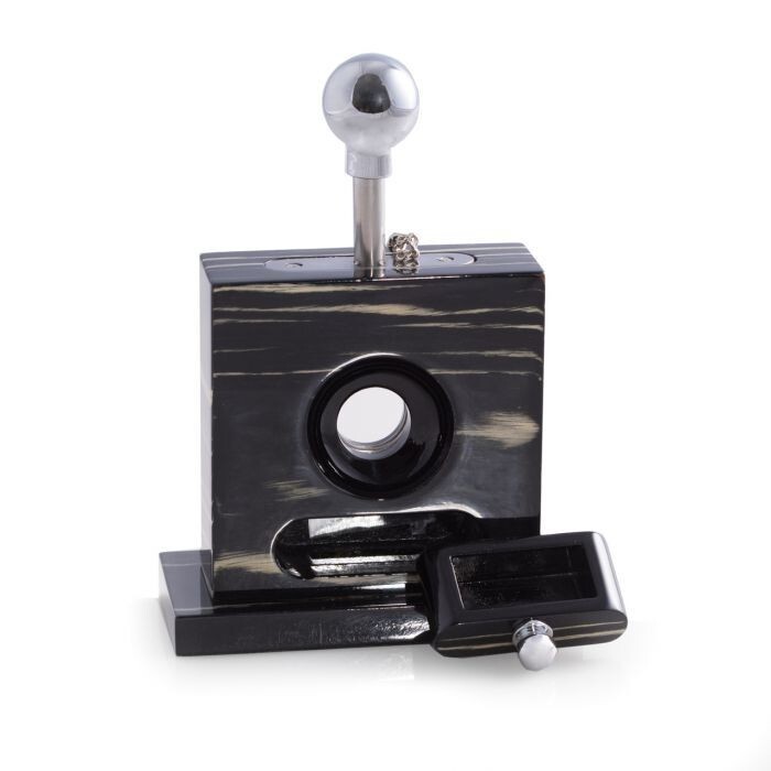 steel table top guillotine cigar cutter comes with drawer for cuttings.