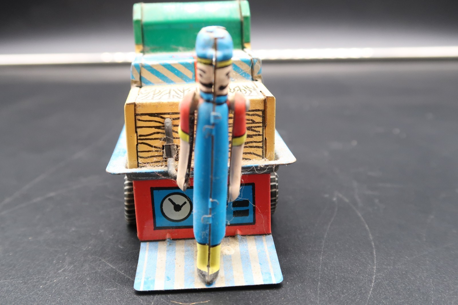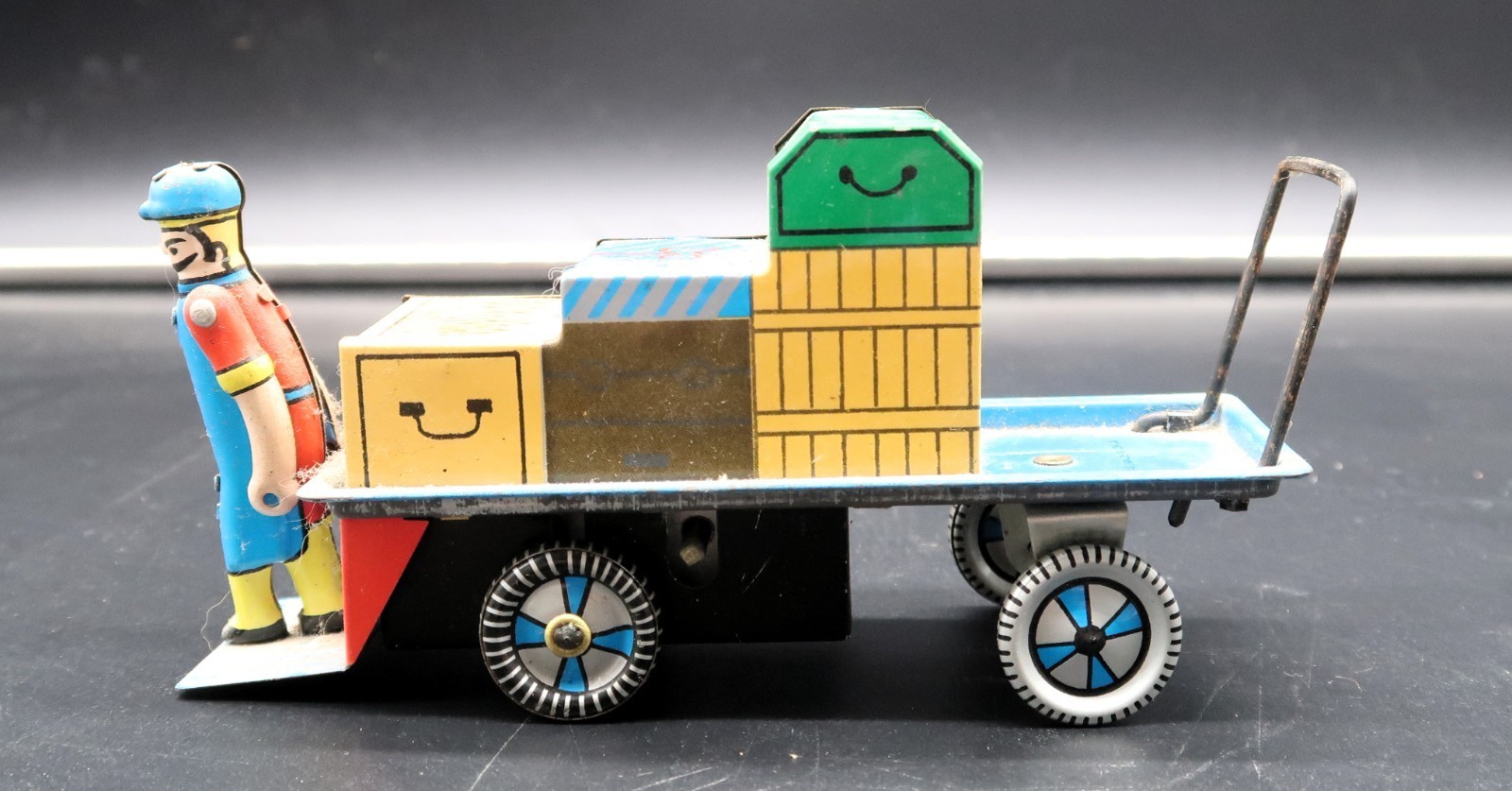 Vintage Baggage Train Cart Worker Tin Litho Wind Up Toy Needs a Key Nice Color