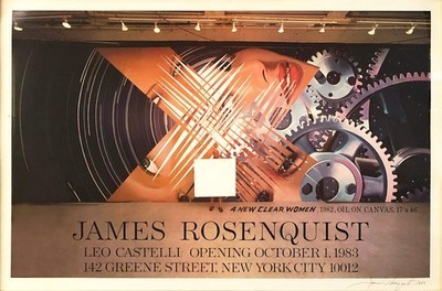 Sku: YY5809-BArtist: James RosenquistTitle: Four New Clear WomenYear: 1983Signed: YesMedium: Offset LithographPaper Size: 25 x 38 inches ( 64 x 97 cm )Image Size: 25 x 38 inches ( 64 x 97 cm )Edition Size: UnknownFramed: No: Inquire with our experts for framing suggestions.Condition: A-: Near Mint, very light signs of handlingSupplemental Condition Information: Small scuff with brown water stain around it in white square center of image.Additional Details: This striking original exhibition poster by James Rosenquist, titled Four New Clear Women, was created for his solo opening at the Leo Castelli Gallery on October 1st, 1983. A bold visual statement, the poster reflects Rosenquist?s fascination with fragmented imagery, commercial aesthetics, and his ongoing commentary on nuclear anxiety and gender representation during the Cold War era. Hand signed by Rosenquist in pencil, this poster is a significant piece of ephemera from one of Pop Art?s leading figures. The composition?s layered, almost cinematic style exemplifies the artist?s signature approach?merging advertising motifs with political undertones. Elegantly presented in a sleek gold metal frame with a oe inch front profile and a 1OE inch side profile, the total framed dimensions measure 26OE x 39OE inches. A collector?s item with both visual and historical impact, this work is a rare find?ideal for fans of Pop Art and Rosenquist?s powerful, image-driven narratives.