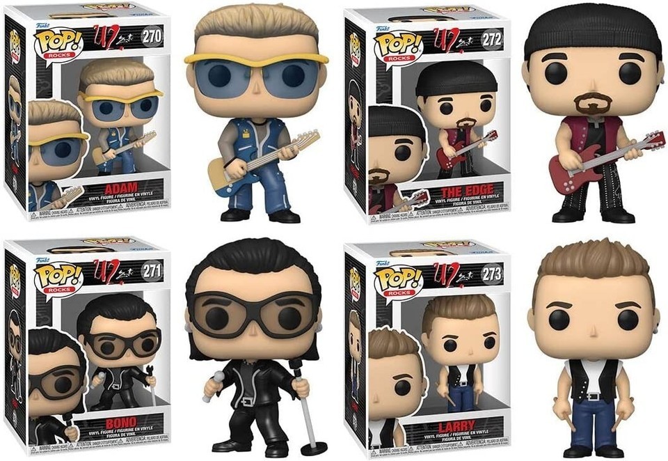 U2 (ZooTV) Funko Pop! Rocks Complete Set (4). Includes Adam, Bono, Edge, and Larry. U2 is an Irish rock band from Dublin. Formed in 1976, the group consists of Bono (vocals and guitar), The Edge (guitar, keyboards and vocals), Adam Clayton (bass guitar), and Larry Mullen, Jr. (drums and percussion). U2's early sound was rooted in post-punk but eventually grew to incorporate influences from many genres of popular music. Their lyrics focus on personal themes and sociopolitical concerns, and throughout their career they have campaigned for human rights and philanthropic causes. U2 has released over 12 studio albums and is among the all-time bestselling music artists, having sold more than 150 million records worldwide.