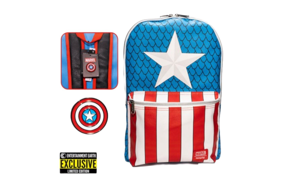 Entertainment Earth Exclusive! Show off your Marvel fandom with the Captain America Cosplay Backpack with Pin Set - Entertainment Earth Exclusive!