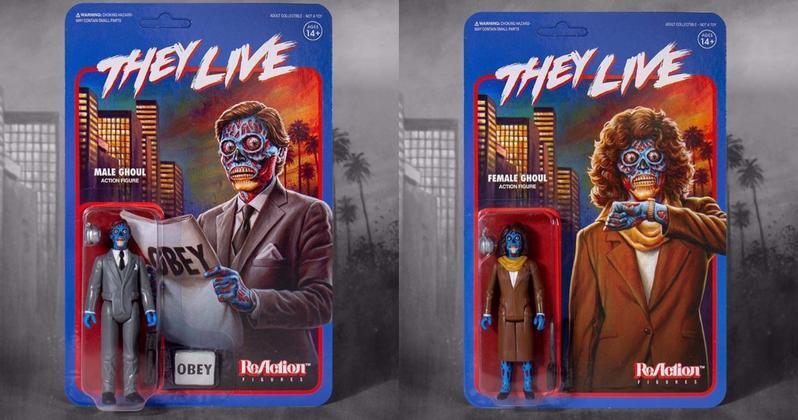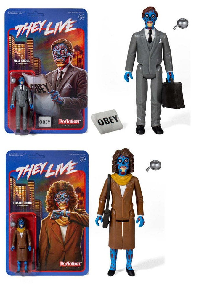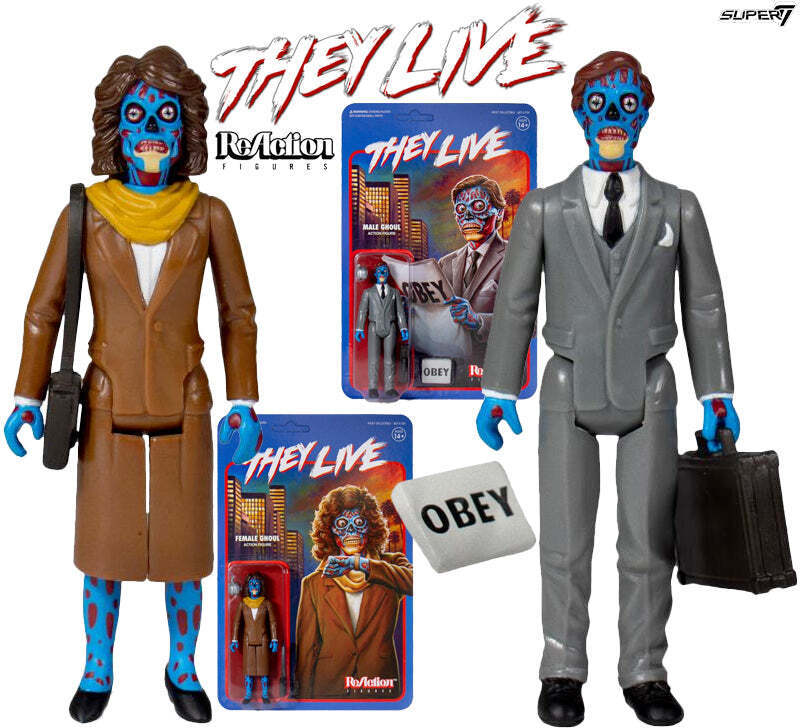 Included in Super7's They Live collection are the '' and the 'Female Ghoul', as seen when Nada puts on his special sunglasses. Each action figure stands at 3.75", and both come with various accessories. The Male Ghoul comes with a newspaper that boldly proclaims, 'Obey'. And he also has a brief case. The Female Ghoul comes with a purse. The sleekly designed package art is pulled directly from this classic thriller and comes with this warning.