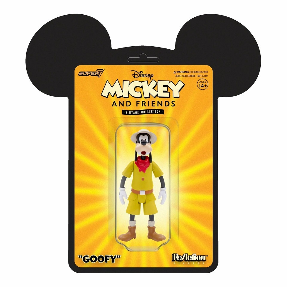 Part of the Disney Mickey Friends Vintage Collection, this 3.75? articulated Goofy figure features our good-natured but not-so-brave hero dressed in jungle expedition gear! Inspired by classic Disney animation and packaged on a mouse-eared cardback, this Goofy ReAction figure will have you ready to hunt down the rest of the Disney Mickey Friends Vintage Collection Reaction figure wave for your collection!