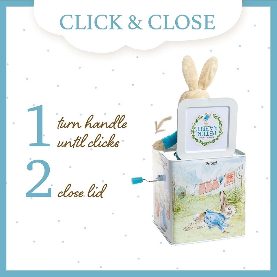 LASTING FUN: Classic jack in the box musical toy is made of durable, sturdy metal and plush puppet pop up. Adorned with storybook artwork of Peter Rabbit, the Good Little Bunny.