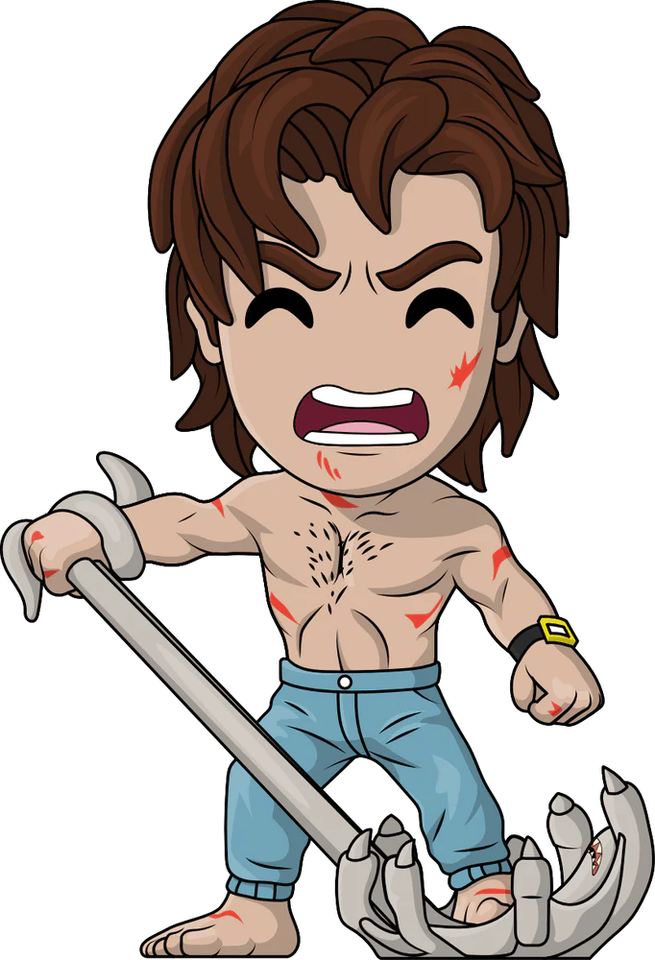 It's okay Steve, Dustin still loves you. The handsome heart-throb, Steve Harrington joins the rest of the Stranger Things crew! Standing at 5.1 inches, Steve is bare foot and bare chested, with some very noticeable chest hair, covered in splatters of red blood around his face and body. His brown voluminous hair is a bit disheveled while he is busy trying to fight off gray flying monster. He is using his right hand to pull the tail of the creature while using his left foot to pin it to the ground. On his left wrist, you can see his gold watch with a black band strapped onto him and his pants are light blue jeans. The exterior of his double-walled packaging shows Steve inside of the Upside Down with hues of dark purples and blues around him inside of a forest. He is in the middle of a fight where he is holding the tail of a gray creature while the other monsters seem to be flying towards him. The interior is a black background with what seems like goo reflecting out of it. This collectible ships in a matte, embossed, protective outer sleeve and a custom sized plastic protector for maximum protection during shipping.