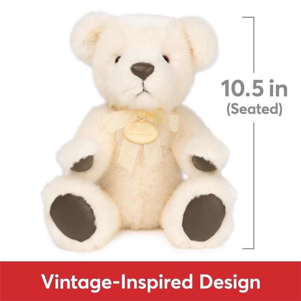 As one of the first companies to design and produce teddy bears, GUND has been known the world over for our legacy of crafting award-winning, unique plush products for over 125 years. We are proud to continue our heritage of excellence into the future for fans of all ages with this special 125th Anniversary bear, Benedict. Since 1963, crafting special bears like Benedict has been our way of honoring the GUND legacy and the families who love our toys. Benedict boasts an iconic, vintage-inspired teddy bear design and a traditional Mohair feel with wispy, buttery off-white plush. Sitting at 10.5 inches from head to toe, this classic bear is adorned with a silky champagne-colored ribbon that holds an elegant and eye-catching metallic gold collector`s medallion. His paw pads and nose feature chocolate-brown faux leather, making this iconic bear a sophisticated choice for collectors. Benedict is also an expressive, charming bear designed with premium articulation in his joints and neck, allowing him to pose in many positions. This commemorative bear`s premium collector`s box is also crafted of elevated materials that make it perfect for safekeeping and displaying with pride through the years. Benedict is surface-washable and appropriate for ages 8 and up. Do not machine-wash or use harsh chemical cleaners. At the heart of GUND is our collection of stuffed animals and plush toys, including our vast array of cuddly teddy bears, bursting with unique personalities. Each plush is made with pride from super-soft, huggable materials that stay supple through the years. From established classic favorites to brand-new modern pals, there`s a GUND teddy bear plush buddy for everyone!