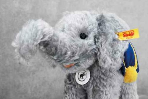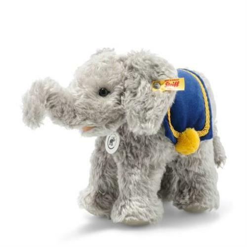 At first glance, it may appear that this distinguished little elephant is made from the type of nubby wool used on many Steiff animals from long ago. In reality, this effect was achieved by creating a specially milled curly mohair with a nostalgic appearance. In keeping with Margarete?s color palette for her original elephant?s saddle, the gray elephant wears a blue velvety saddle trimmed with elaborate yellow-gold braiding and woolen pompoms.