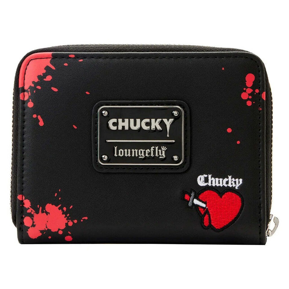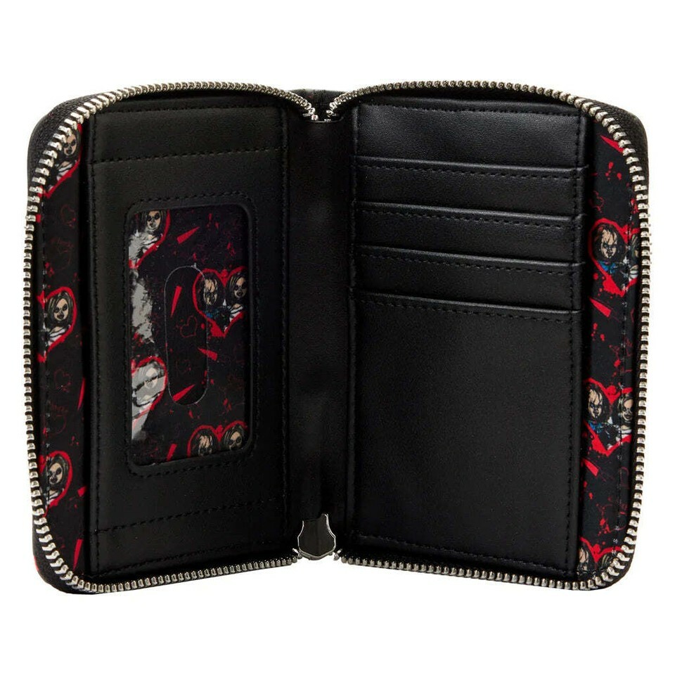Schedule a playdate with a killer couple! Escape with the Loungefly Bride of Chucky Zip Around Wallet. On the front, Chucky and Tiffany (in her bridal outfit), pose against a black backdrop, spattered in blood. On the back, the word Chucky appears, along with a red heart with a dagger through it. Inside the wallet, there are 4 slots for holding cards and 1 clear slot for holding your ID. It?s the perfect accessory to accompany you on your daily haunts.