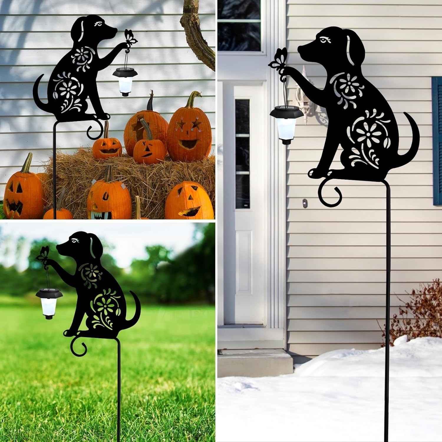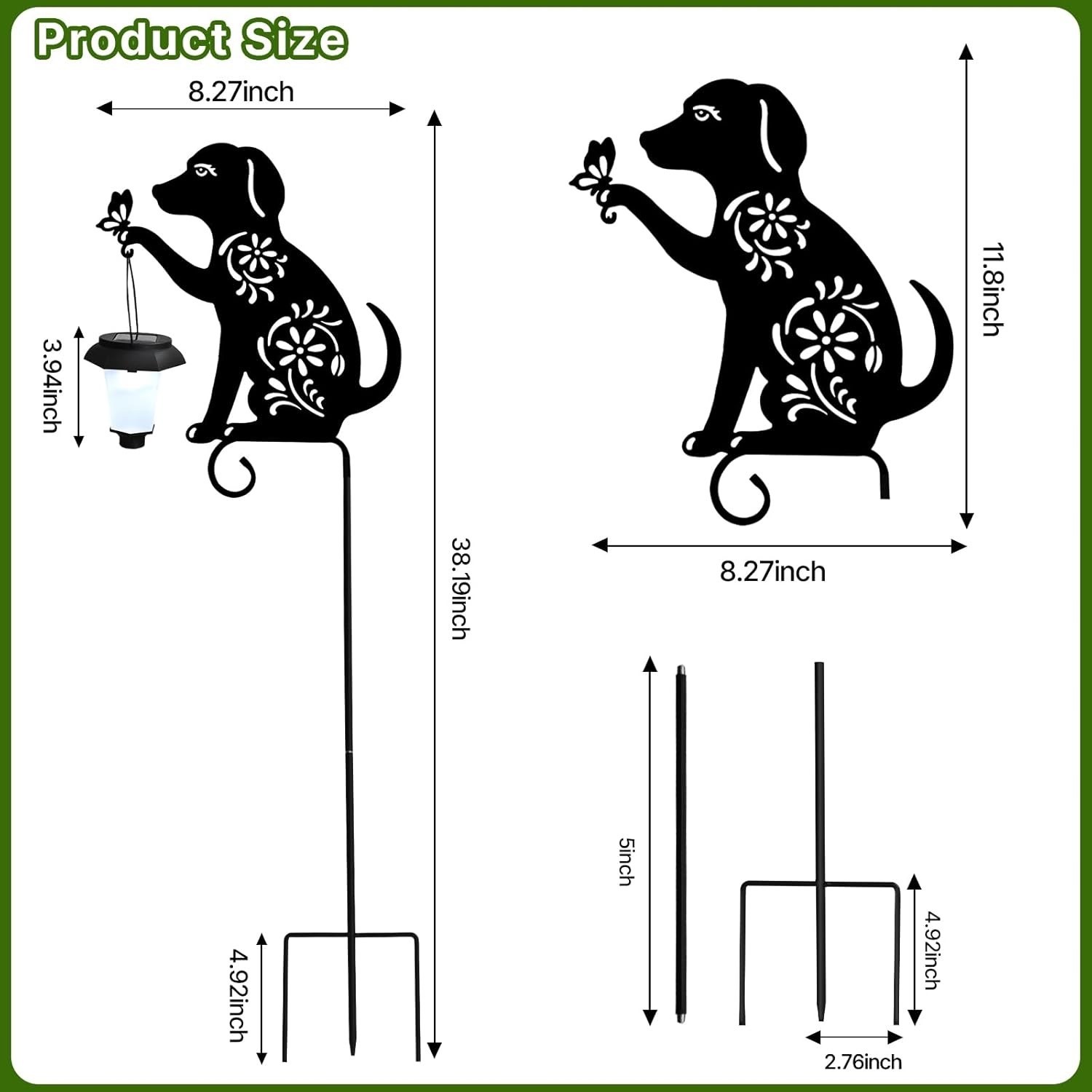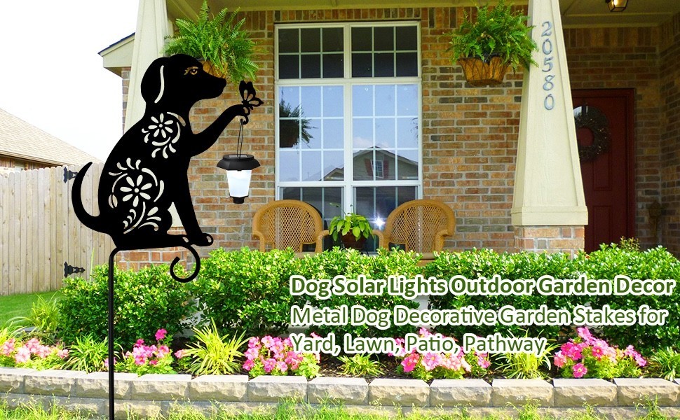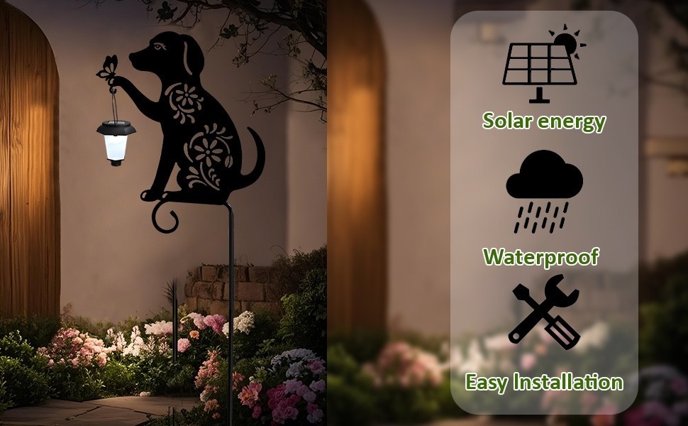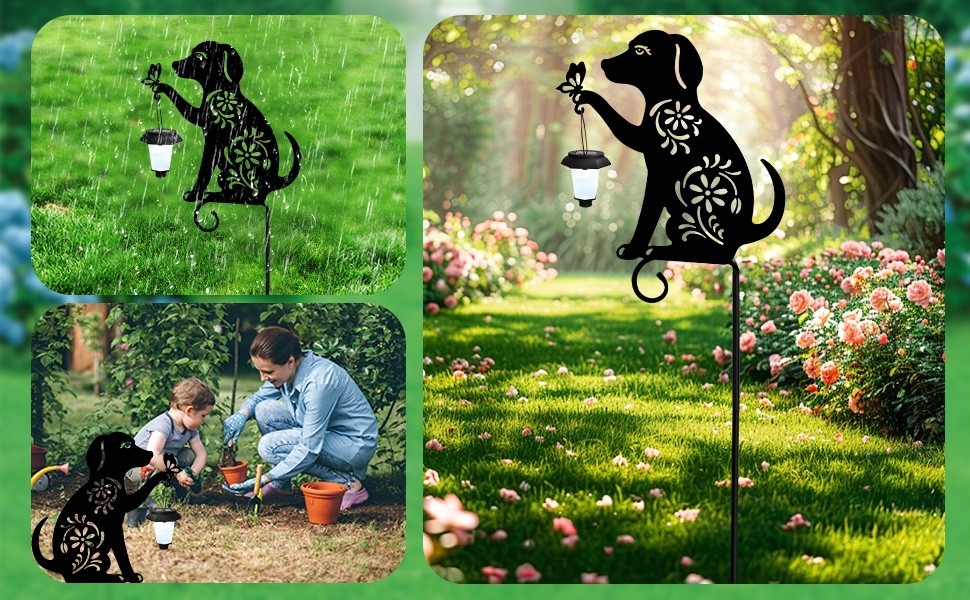 Dog lovers will adore this stake. The metal decorative stake features the silhouette of a friendly dog holding a solar lantern and is specially designed with a four-leaf clover pattern for good luck! The cute dog is handcrafted from high quality metal and coated with a waterproof coating. This solar dog yard stake sign is sturdy and durable even in the sun and rain without worrying about fading and rusting easily. The metal stake can be anchored anywhere in your yard or garden.