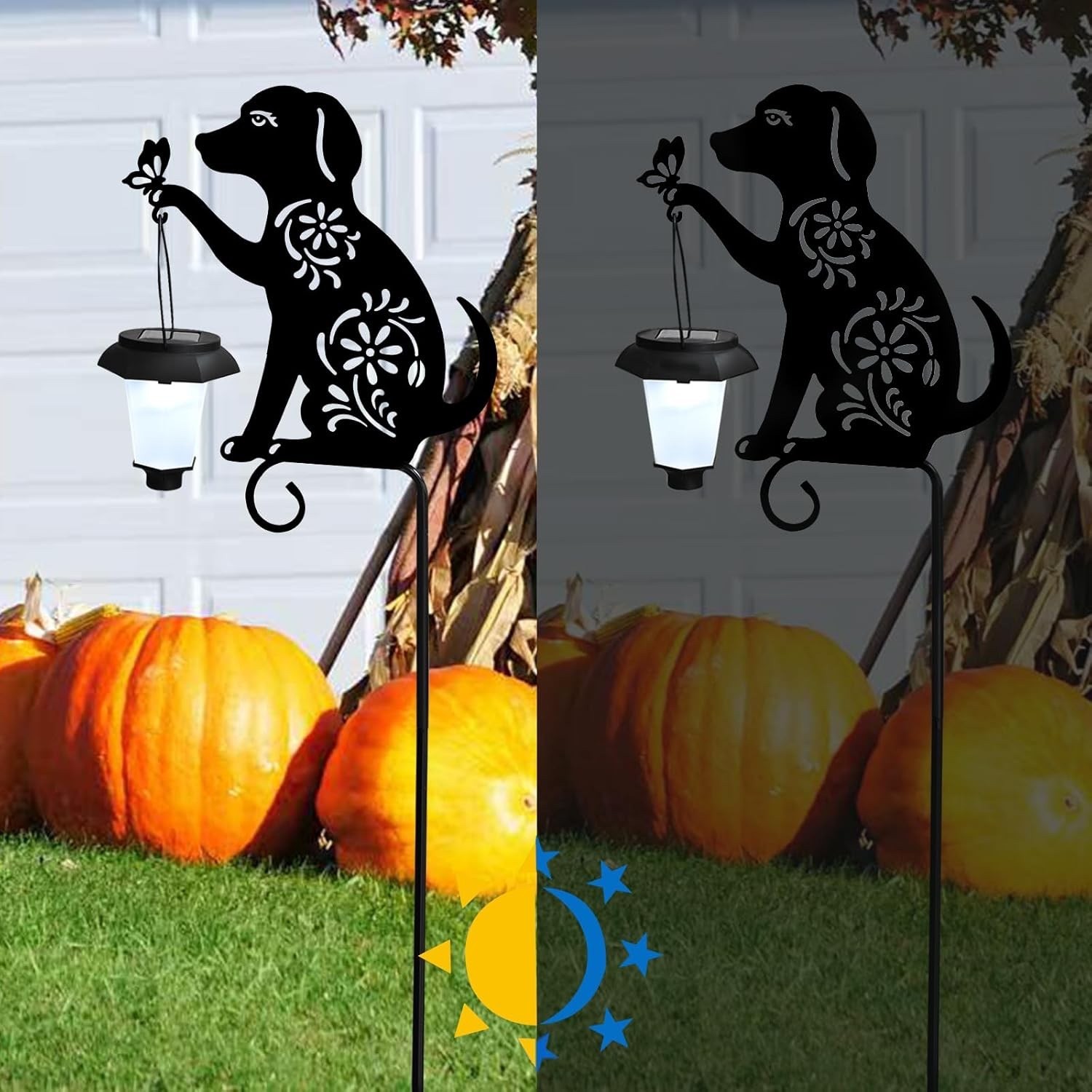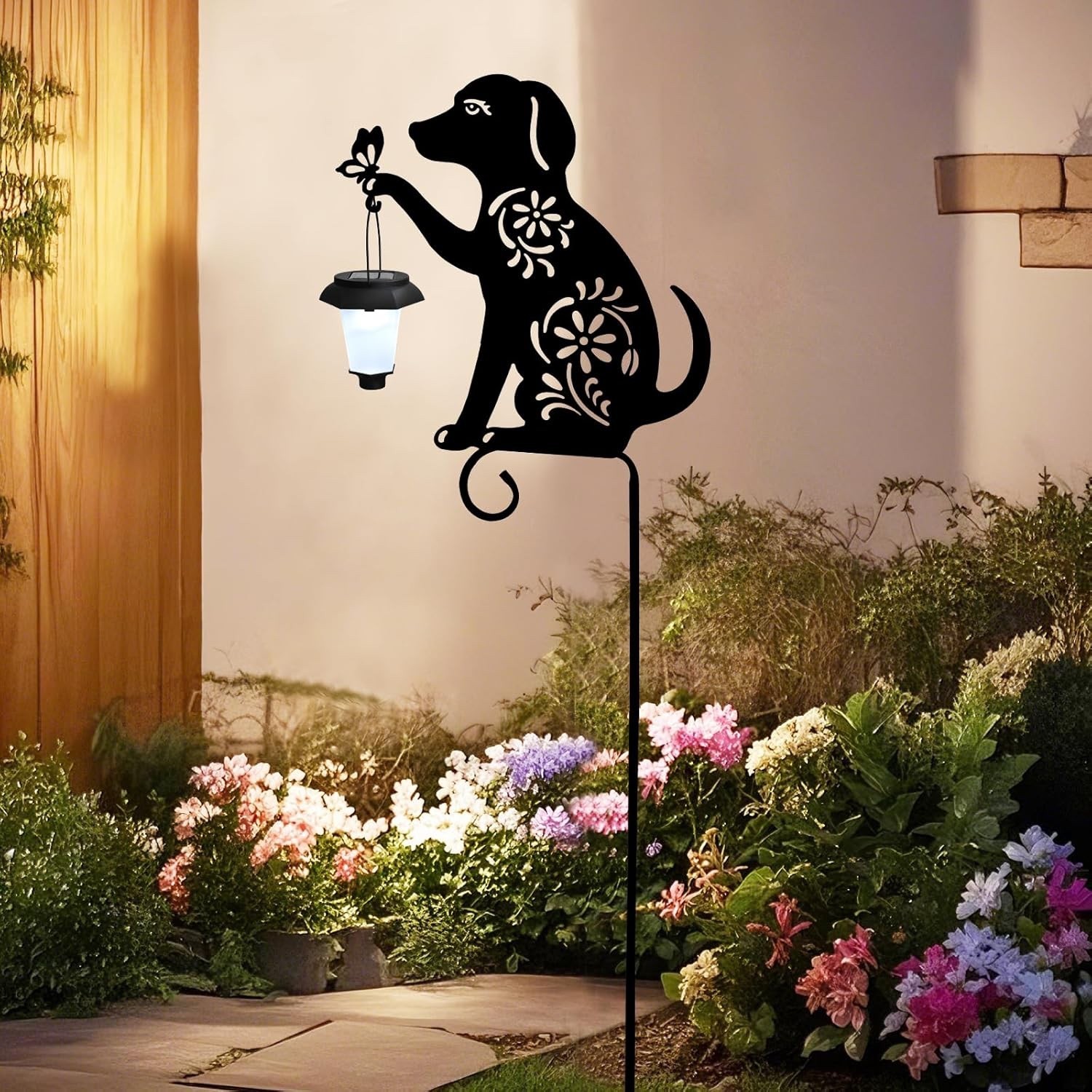 Solar Powered Dog Silhouette Yard Stake Holding Lantern Outdoor Garden Art Decor