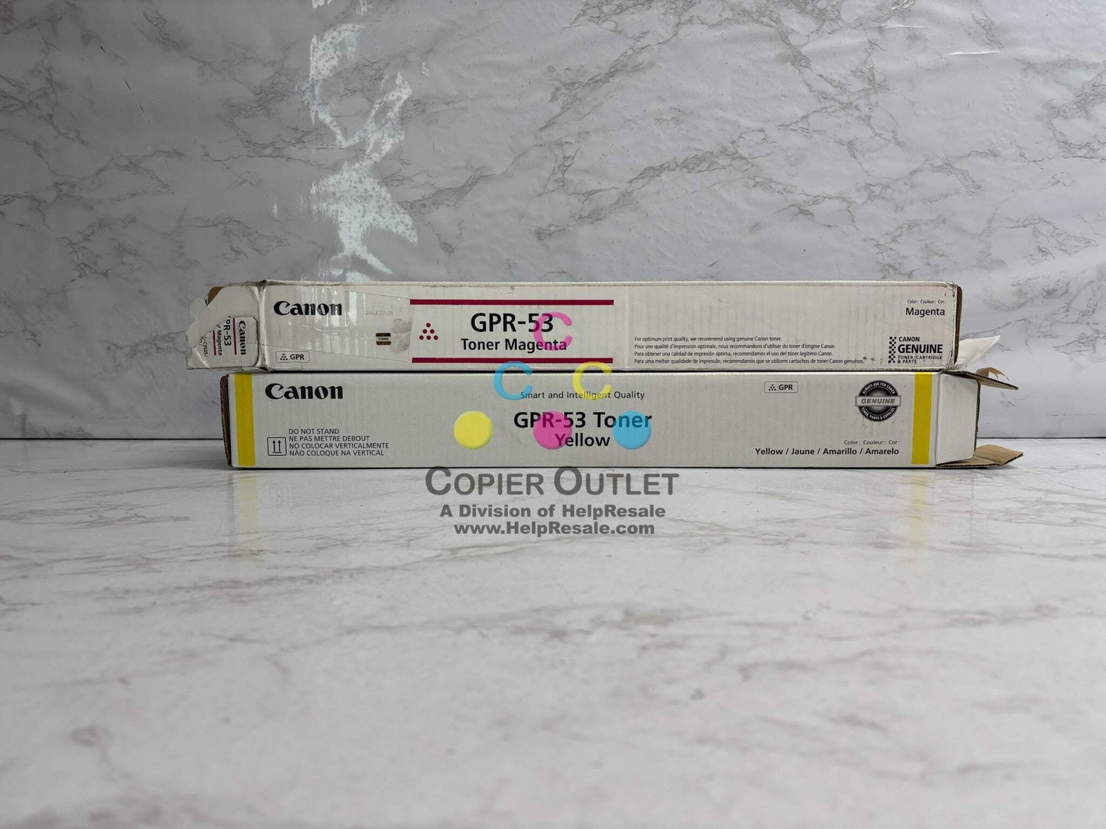 Lot Of 2 New Open Genuine Canon GPR-53 (8526B003) Magenta Yellow Toner New - Open Boxes ***Please See Reference Photos*** Same Day Shipping For imageRUNNER ADVANCE C3325iC3330i, C3525i,C3525i II,C3525i III,C3530i,C3530i II, C3530i III DX C3725i,DX C3730i,DX C3826i,DX C3830i,DX C3835i Listed by: Renee (Sales Team) ?Life is often made up of trying things...just to see if they will work? -RRW (A positive moment brought to you by Help Resale) Copier Outlet (A Division of Help Resale) Copier Outlet was established in 1993. We buy and sell both domestically and internationally and have wide assortment of copiers, consumable and accessories of all popular brands. All of our copiers are in house and available for your inspection. They all have been tested and rated for functions, cosmetics and overall appearance. Our consumable and accessories selections include toners, imaging units, developers and copier parts such as fax board, fixing unit, fuser unit, roller, cleaning brush, drum blades and etc. For more detailed information on our copiers, consumables and accessories, please feel free to give us a call. We are more than happy to assist you with the pricing and guide you to find the copiers, consumable and accessories you wish to buy. Best Regards, Copier Outlet Sales Team Monday - Friday: 9:00 am to 5:00 pm (PST) Copier Outlet Promo Video - YouTube Video will open in a new windowUsing the App? Paste link into a browser window: [isdntekvideo] All product and company names are trademarks TM or registered trademarks of their respective holders. Use of them does not imply any affiliation with or endorsement by them.