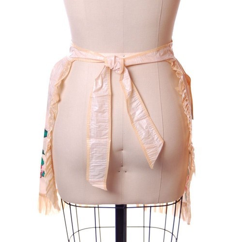 Pale yellow plastic apron in a plaid design with large red rose motif. Yellow ruffle and pocket trimmed in ruffles. No label. It measures 29? from ruffle to ruffle. 18? including waistband long. The ties are 18? each. In excellent condition except for one burn mark near top as shown.
