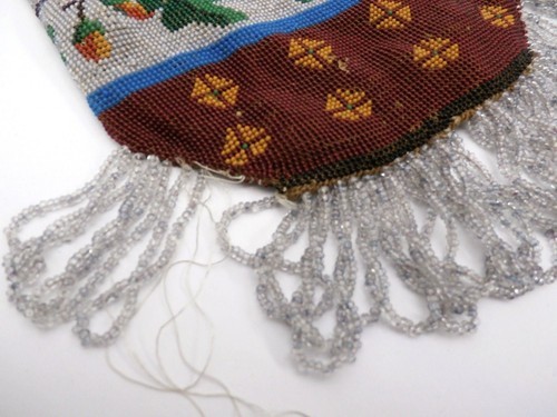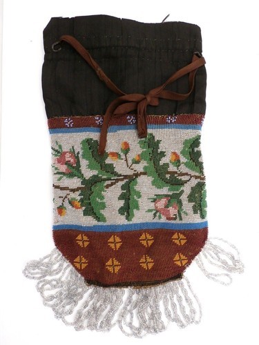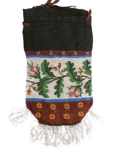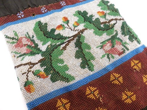 Antique hand-beaded drawstring purse features oak leaves and acorns, an unusual theme.