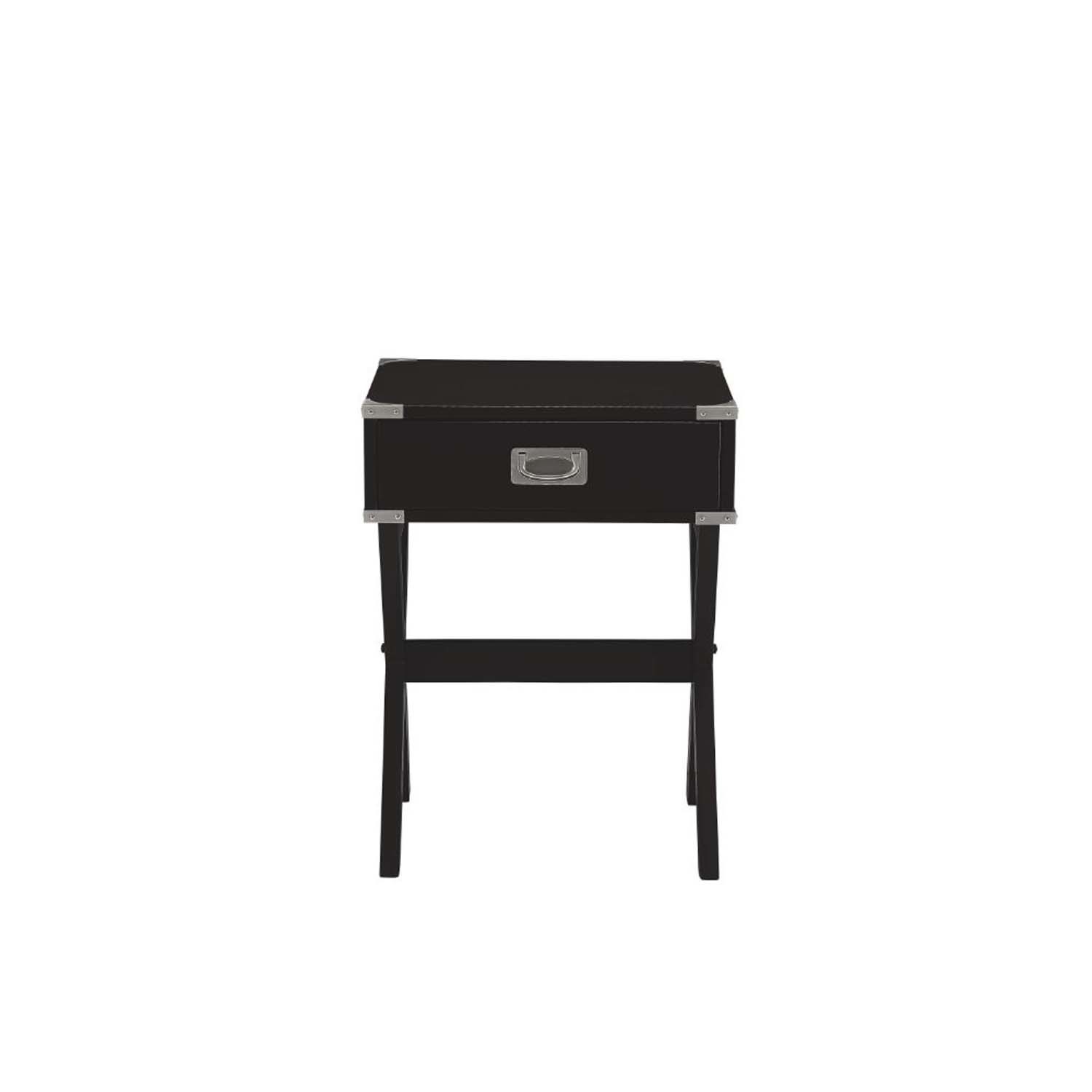 Features: Square Table 1 Drawer Wooden Top w/Metal Corners Wooden "X" Shape Base Crossbar Support Drawer Size: 15" x 9" x 3"H, GLIDE Side Metal, Felt-Lined Not Included Set Includes: One (1) Accent Table