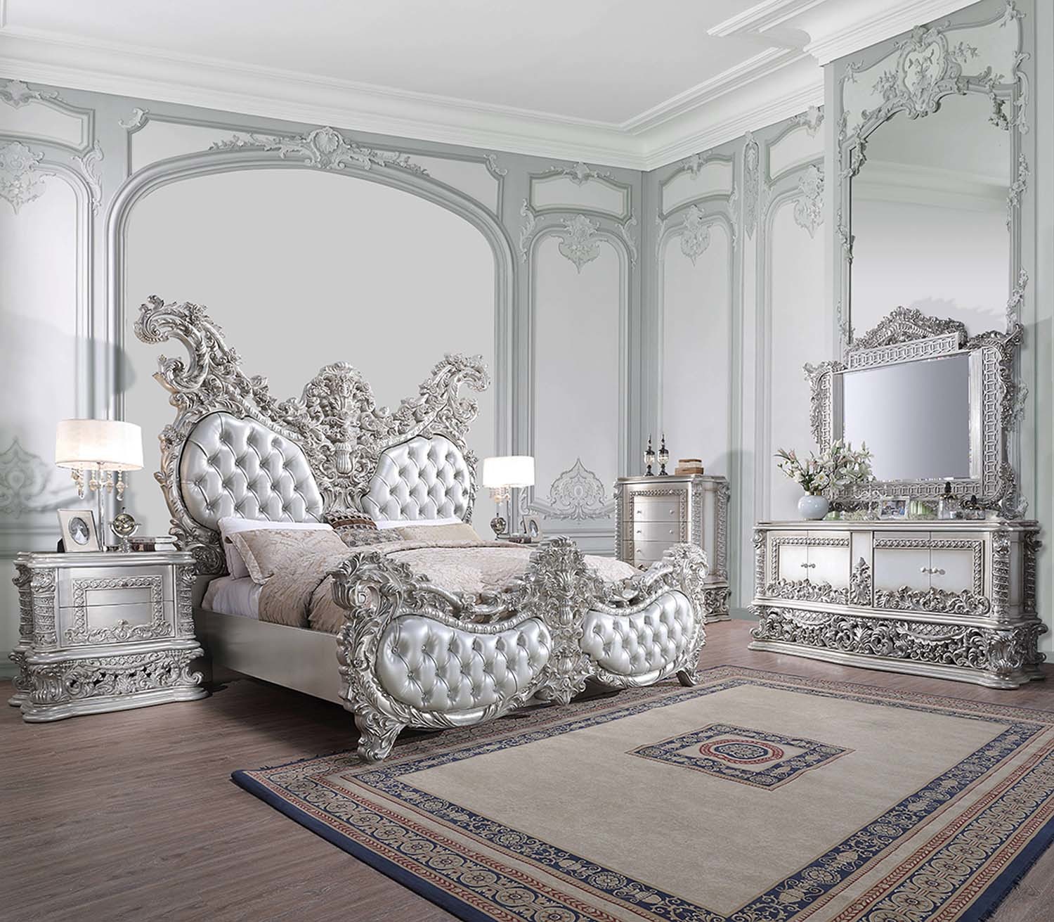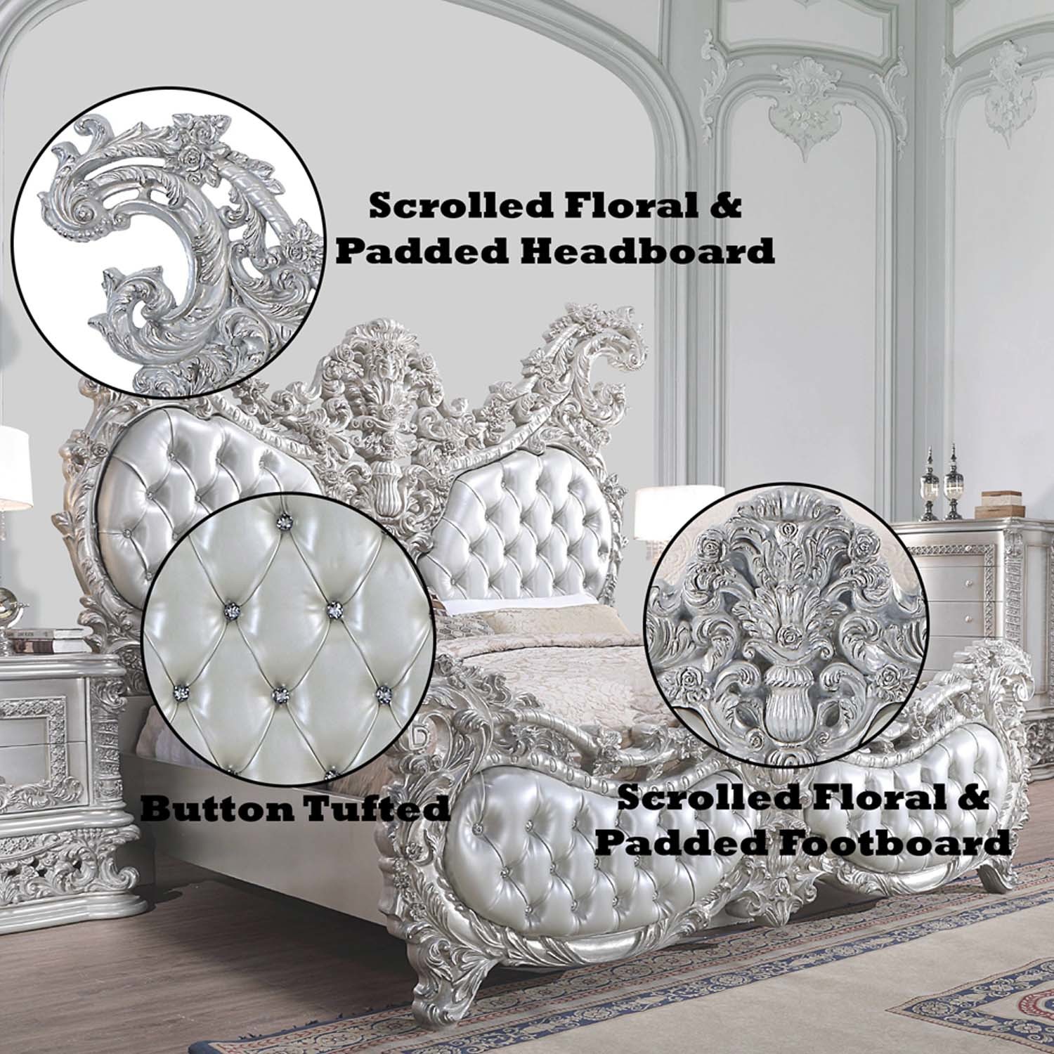 Characterized with button-tufted upholstery, intricate scrollwork, and lustrous finish, the Valkyrie Bedroom Collection provides the feeling of luxury and sophistication. Ornate carvings with floral scroll design on each piece boast extravagant silhouettes and dramatic style. Antique platinum finish paired with muted gray tone fills the collection with a noble and elegant flair. Give your interior a royal touch and classic look with the Valkyrie Bedroom Collection.