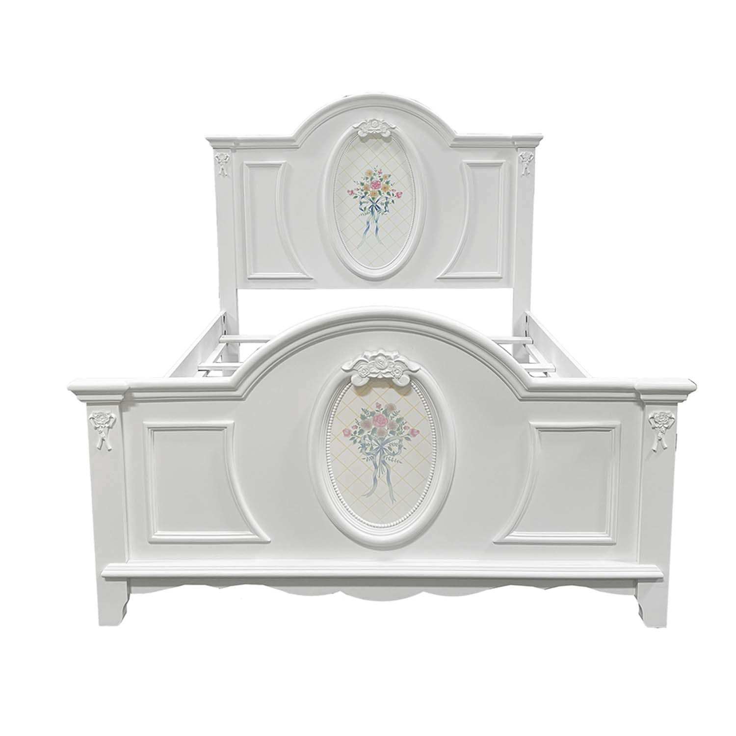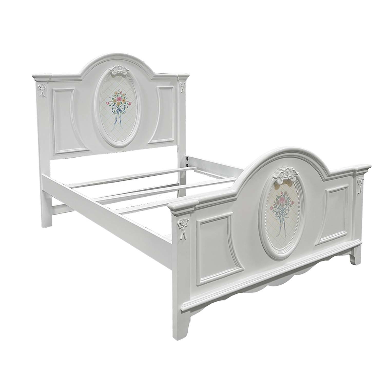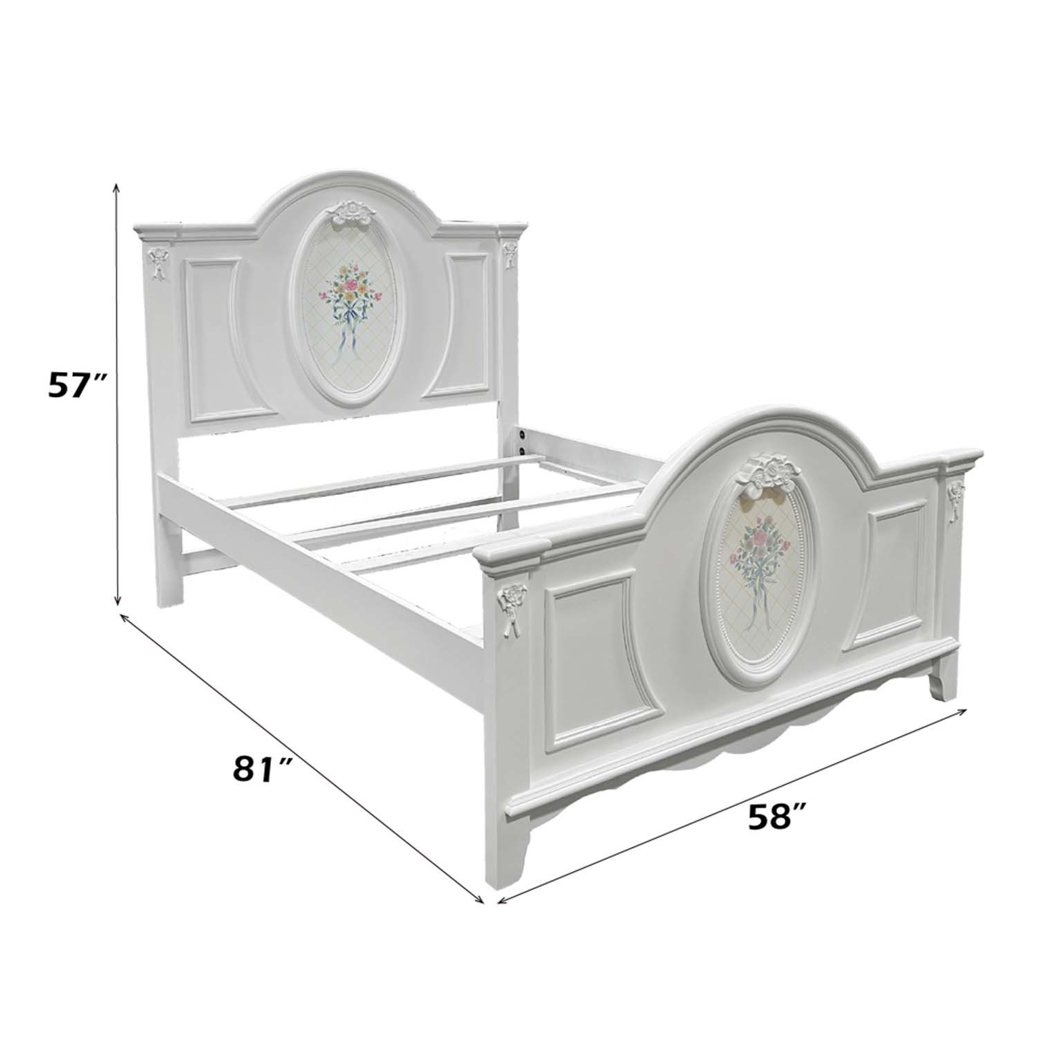 Features: Panel bed (Trundle Sold Separately) 4 Slats Included(4 Support Legs) - Box Spring Required Arched Headboard/Footboard Oval Rope Molding with floral motif decals Durable construction built to withstand daily wear Set Includes: One (1) Full Size Bed
