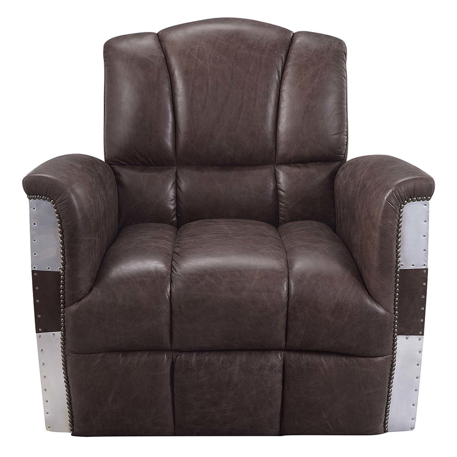 Features: Industrial Accent Chair, Tight Back Seat Cushion Top Grain Leather, Nailhead Trim, Patchwork Aluminum Frame Seat: Full Foam; Inside Frame: Wood+Plywood, Foam Backrest: Inside Tight Cushion+Horizontal Tufted, Outside Patchwork Aluminum Frame Armrest: Inside Flared Padded, Outside: Patchwork Aluminum+Top Grain Leather Frame Set Includes: One (1) Accent Chair