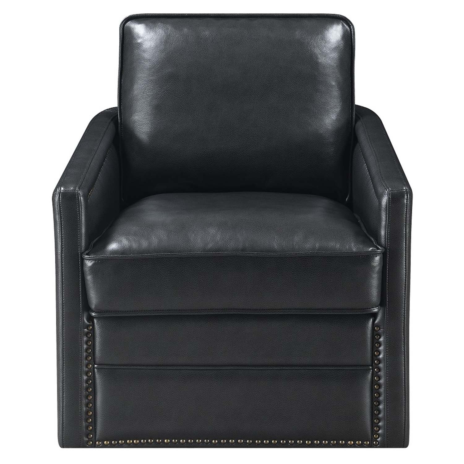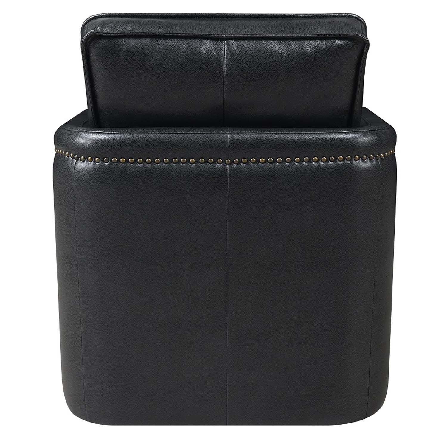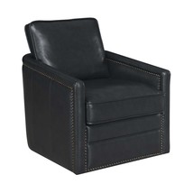 Vintage academia charm merged with modern function; the Rocha accent chair features a swivel function for that contemporary pizzaz. Top-grain leather is used for a luxurious finish. The nailhead trim amplifies the quaint design. Smooth to the touch and cozy when sitting, creating the perfect seat for a home office or library. Available in brown and black finishes.