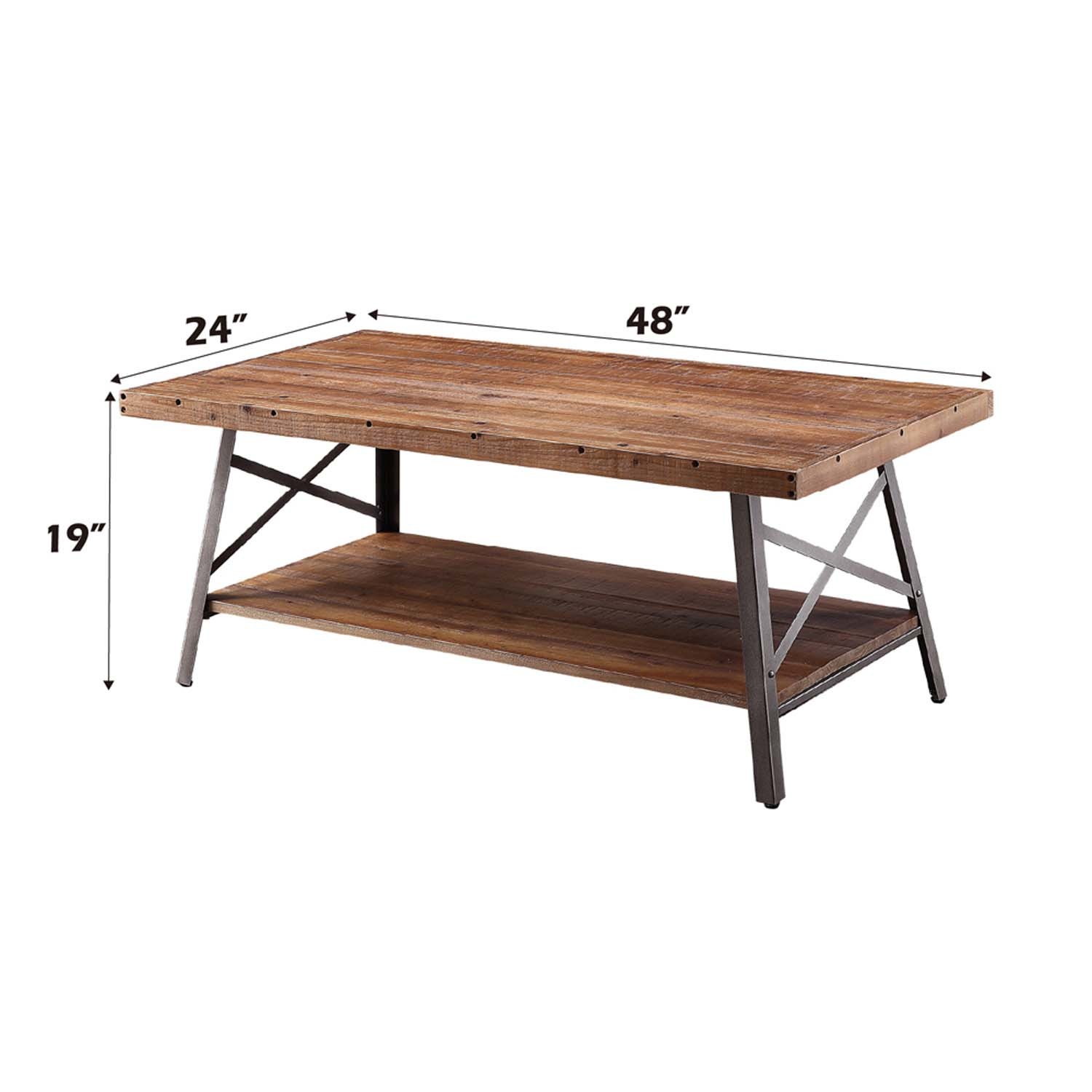 Features: Rectangular Coffee Table Open Compartment (Bottom Wood Shef) Features: Wood Top Shelf, Metal "X" Shape Leg Wood Top Shelf: Weathered Finish, Pine Wood, Top Size: 18mm Thick (NO Apron) Metal "X" Shape Leg: Metal Tube Set Includes: One (1) Coffee Table