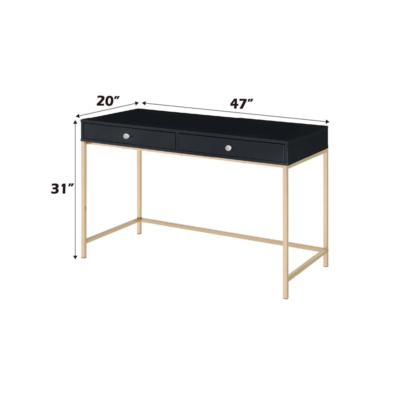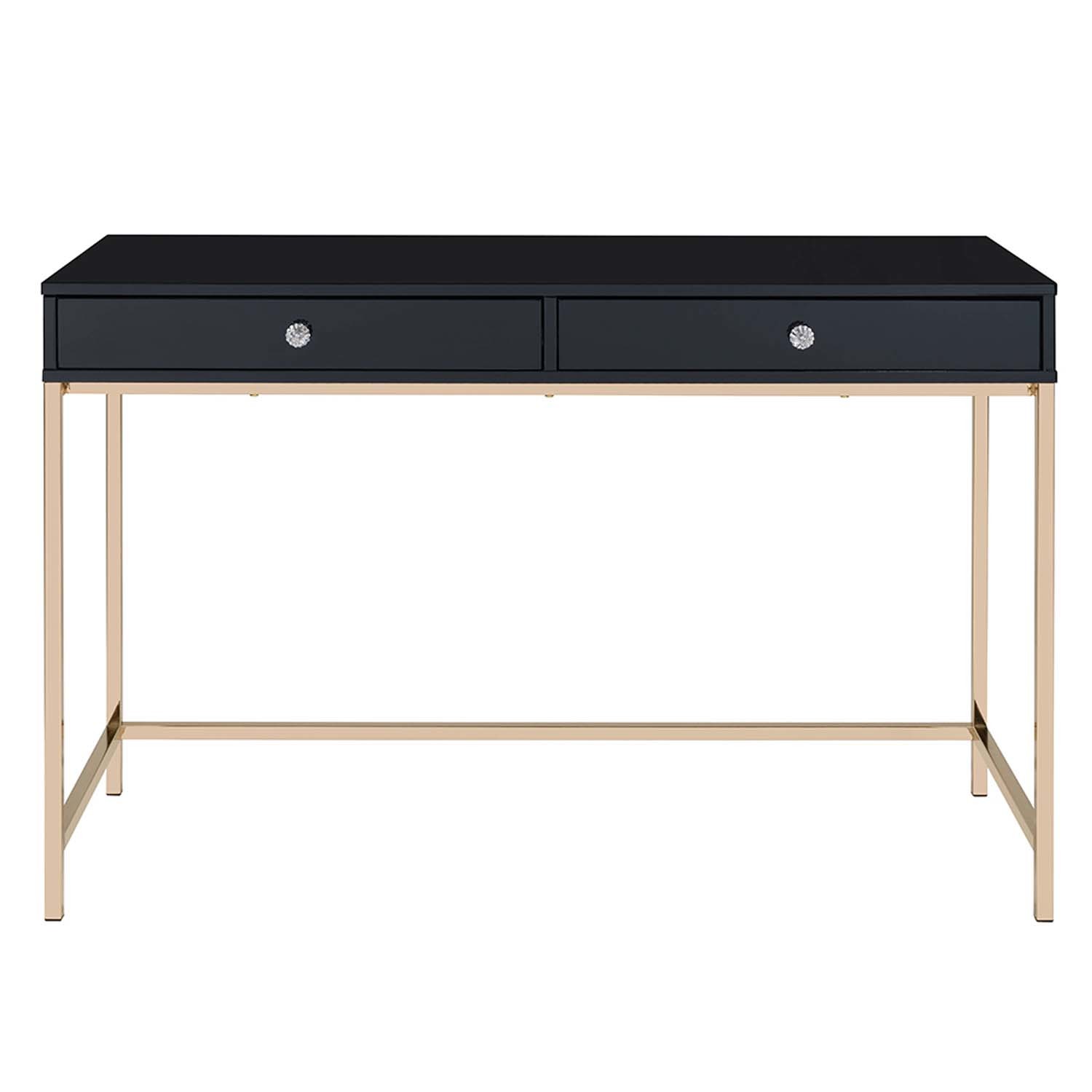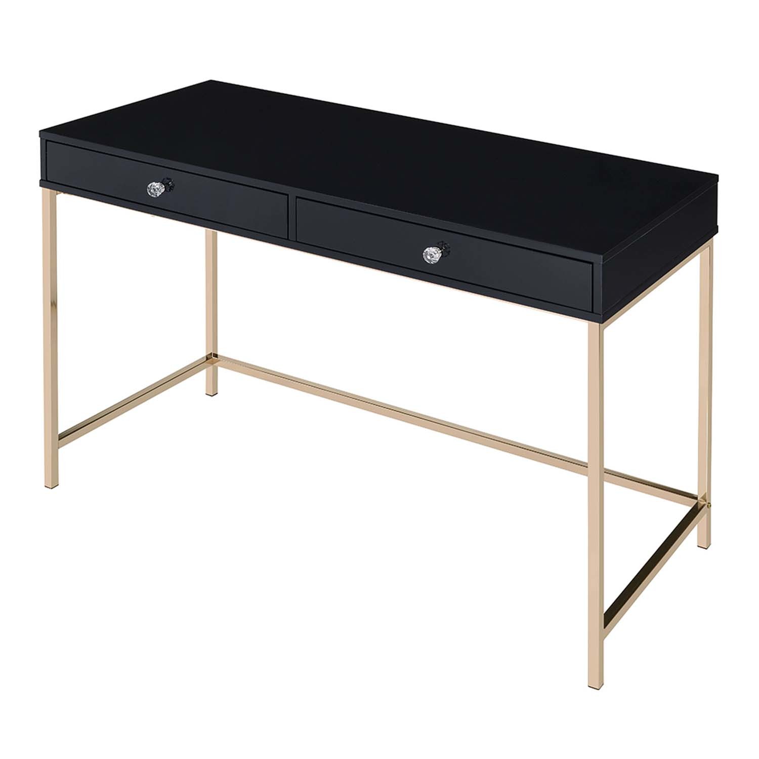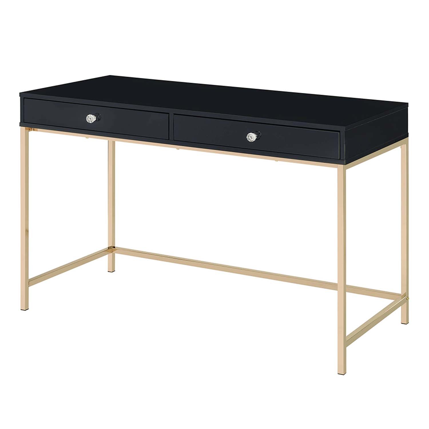 Features: Rectangular Writing Desk Storage: 2 Drawers Metal Leg Base: Gold Finish (Open Base) WOOD TOP CASE w/Drawer: Assembled Top Drawer High Gloss Finish MDF (Drawer Apron) Set Includes: One (1) Writing Desk