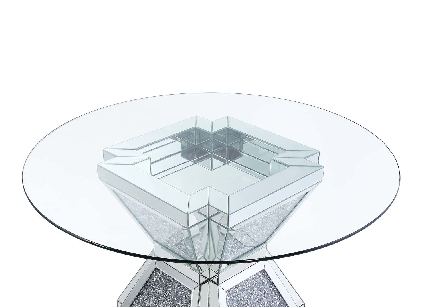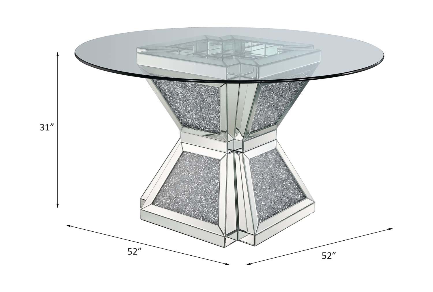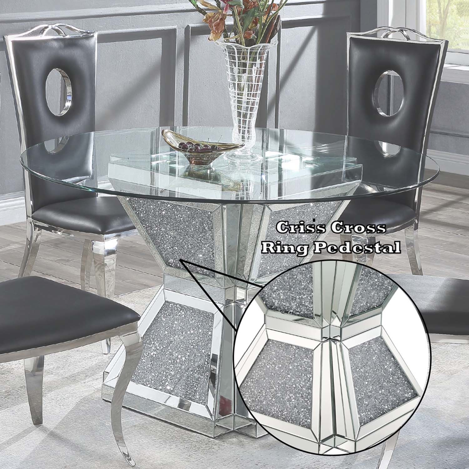 Features: Round Bevelved Glass Top Mirrored Pedastal base Faux Diamonds Inlays Crafted with quality materials for lasting use Designed for comfort and everyday functionality. Set Includes: One (1) Dining Table