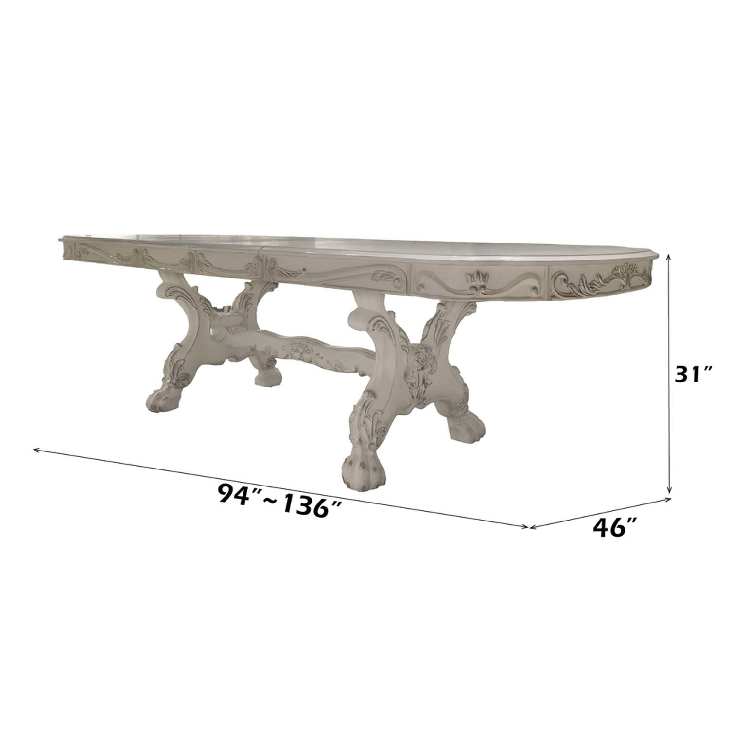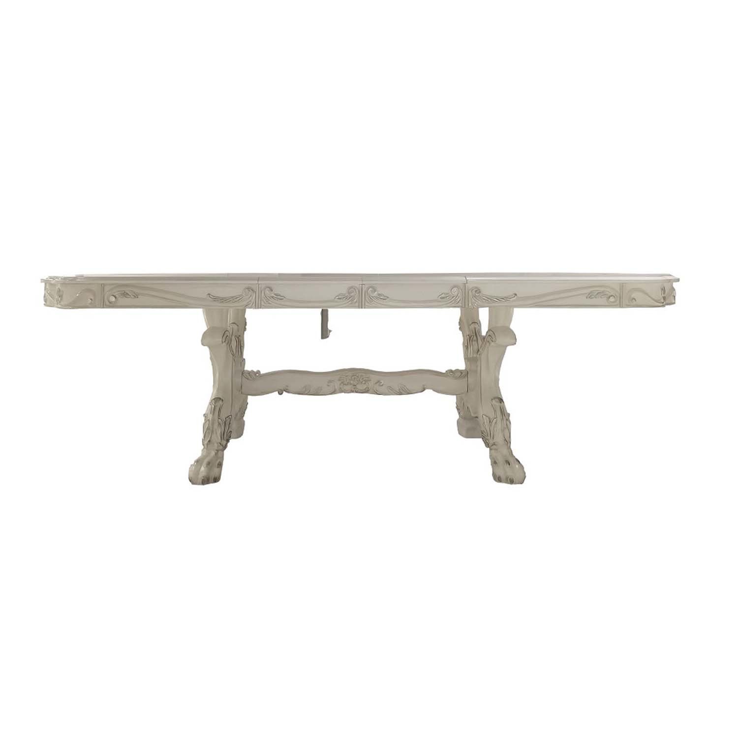 Masterfully created, the Dresden dining table is not for the minimalist. With lots of fine details throughout it to generate a stunning piece. The rectangular table features a trestle base and sits on refined claw legs. The table features a vine and scroll-decorated apron and base. With its two included 16" leaves to accommodate all your guests making it a breeze to host dinner parties. The bone-white finish is a blank slate for various color schemes.
