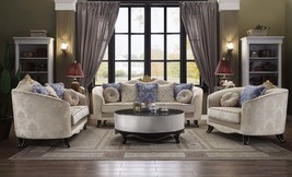 The Sheridan loveseat is defined by comfort and style. This beautiful loveseat features a solid wood molding crown with a tight back and loose seat cushions in classic cream fabric upholstery. Each piece of this sophisticated living room set boasts of elegantly arched backrests and curved arms. This collection with contrasting accent pillows will bring sophistication to your living room and will add elegance to any room Decor.