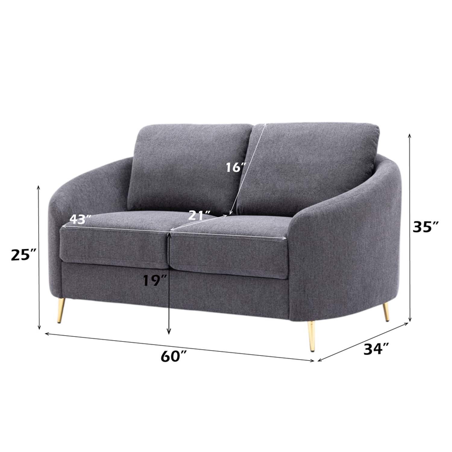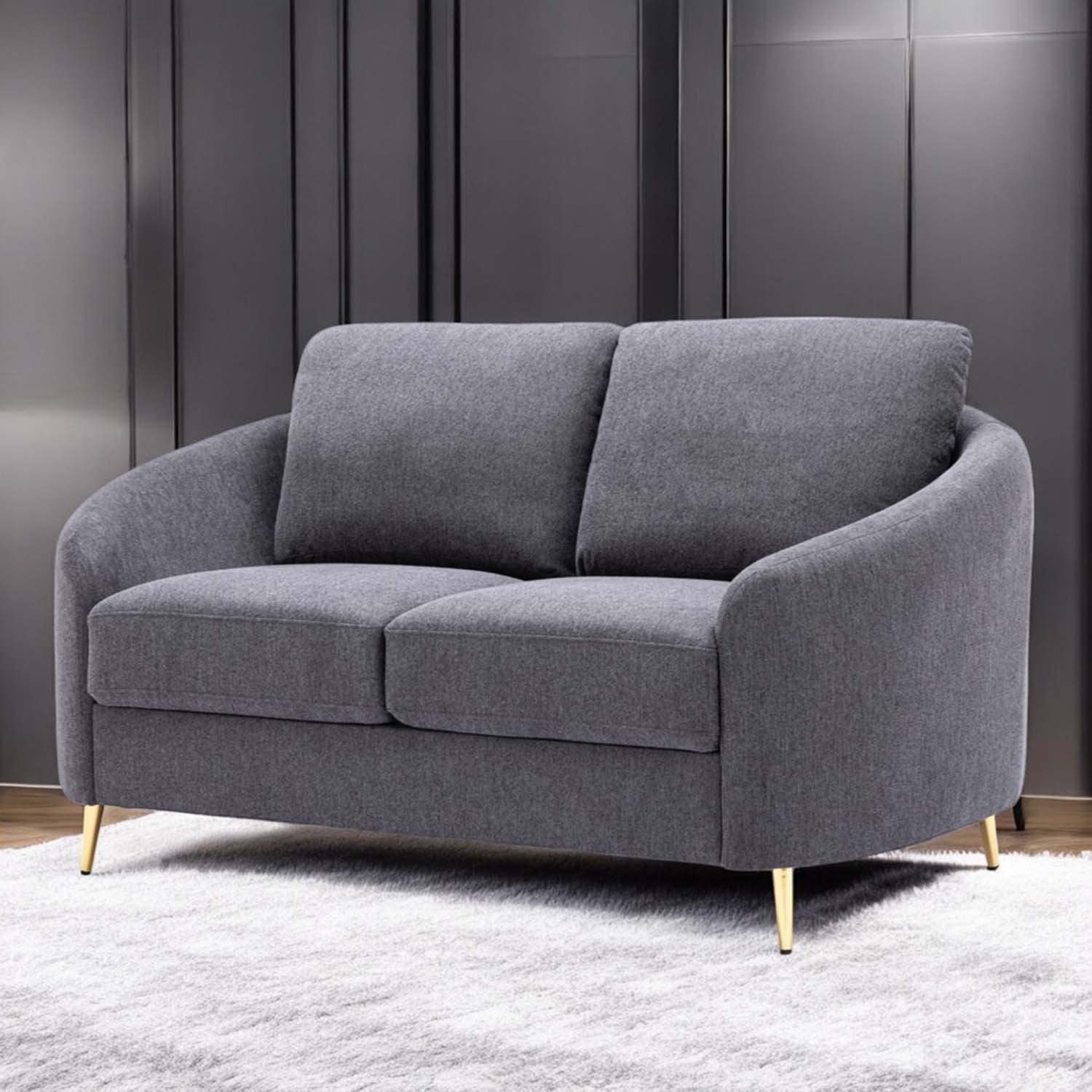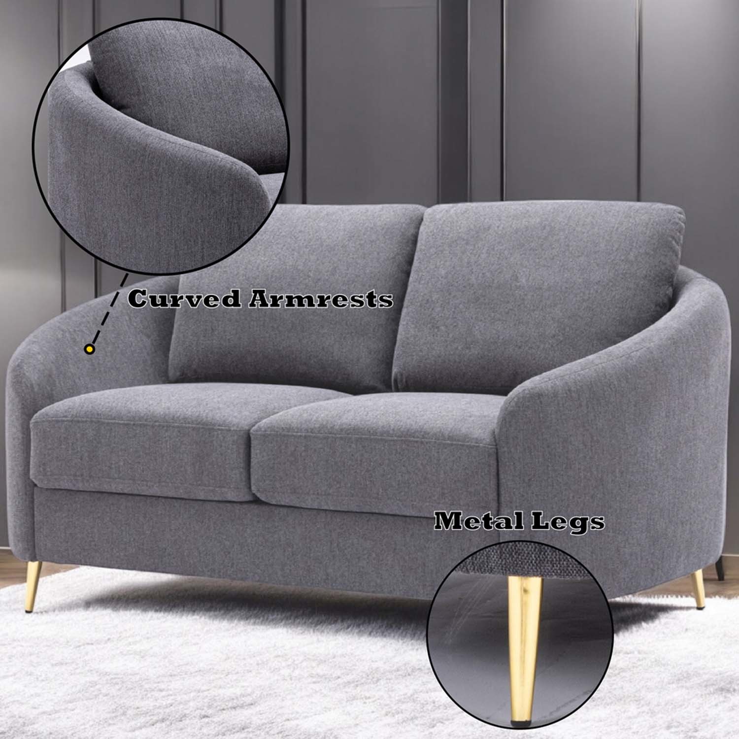 Slightly rounded and slopped armrests are used to create a modern silhouette on the Yuina loveseat. The softness of the gray linen upholstery counterbalances the gold metal legs for a clean stylish look, also making it easy to style with its neutral tones. Plush seat cushions make for a lush seating experience for you and your guests. The pinewood inner frame is resilient and will last years of use.