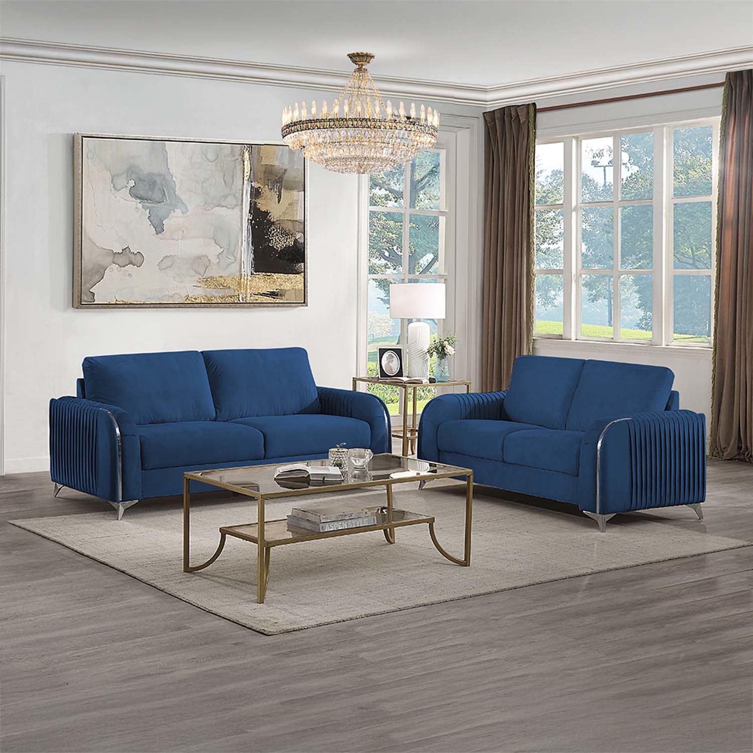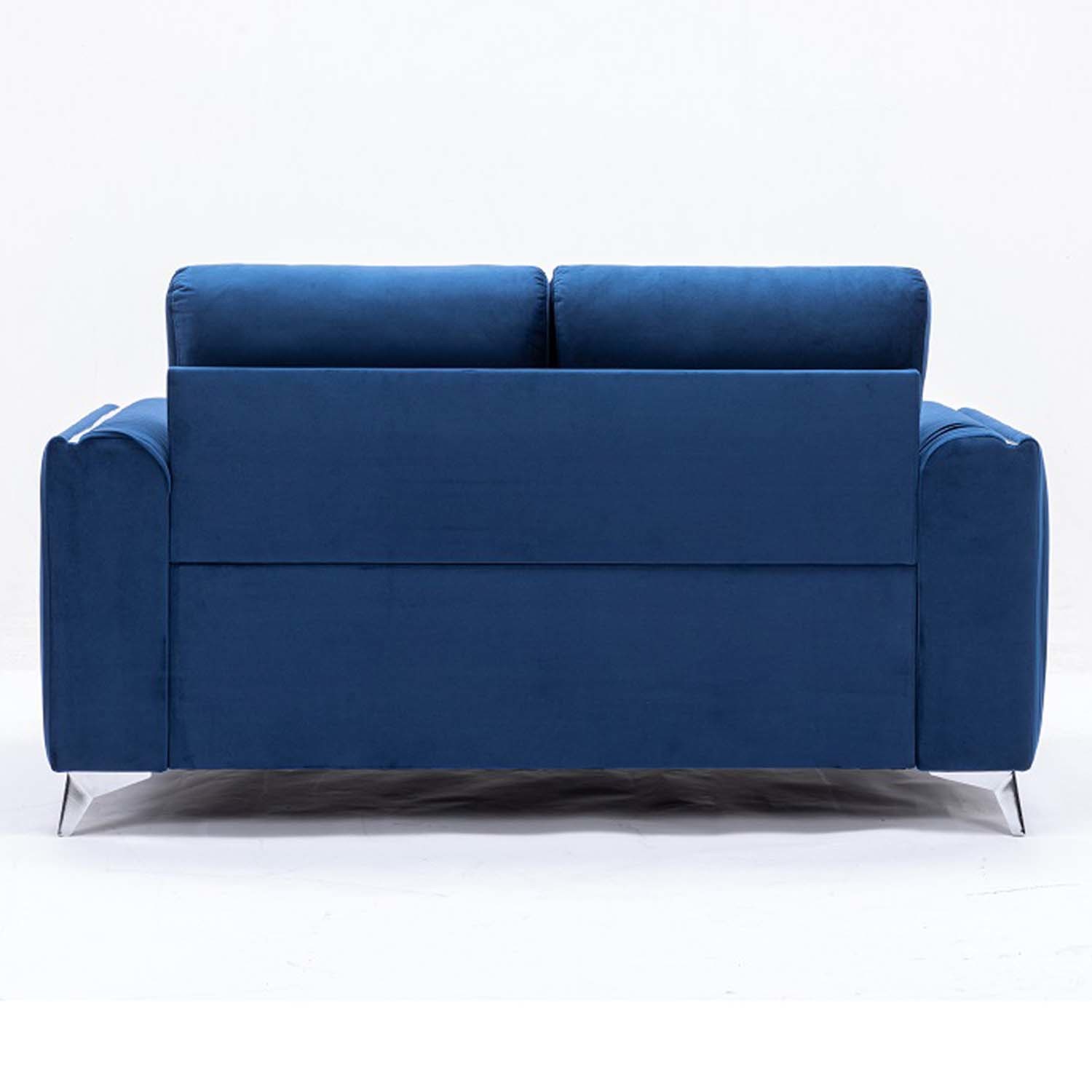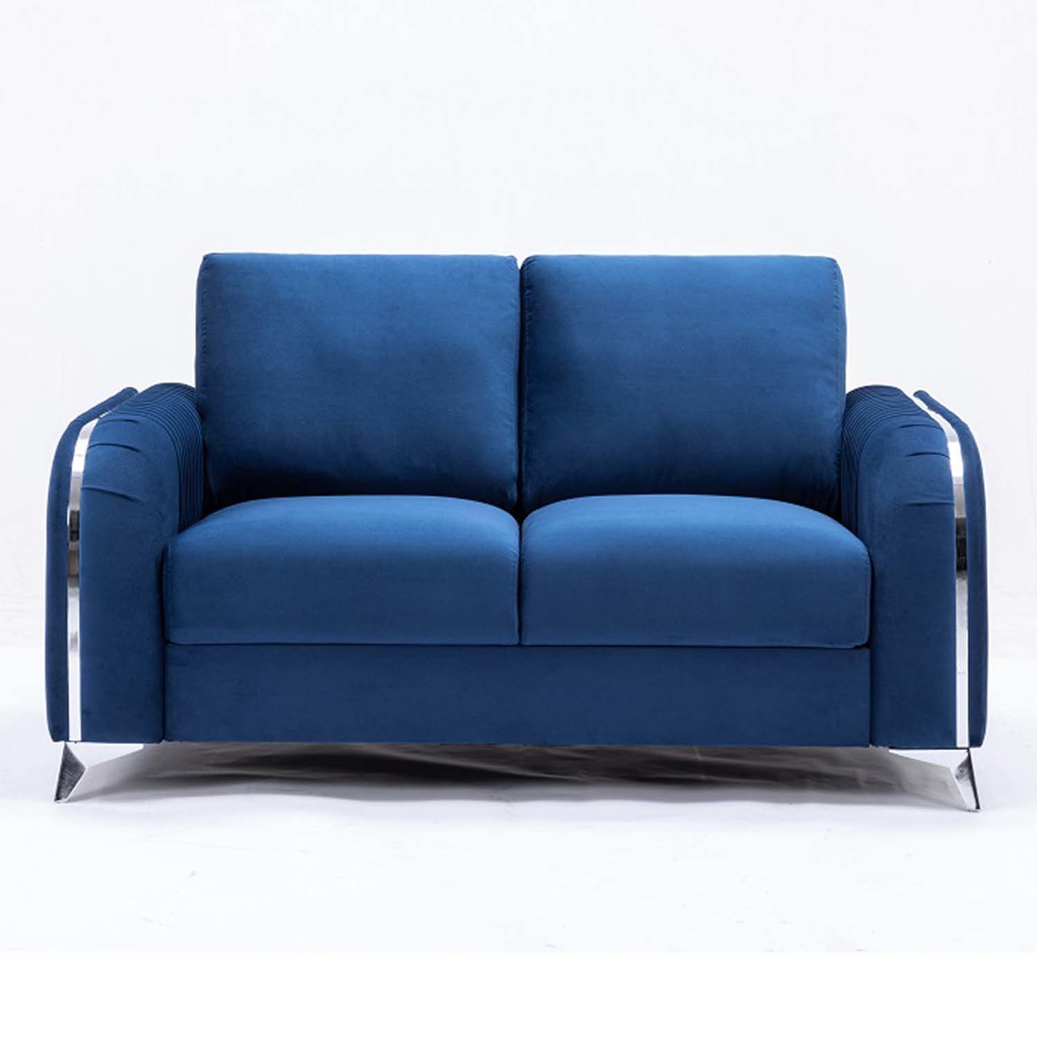 Make a bold statement with the Wenona blue velvet loveseat. The blue color of the velvet upholstery is a classic color that will provide a fun pop of color in any home. This loveseat is highlighted with polished chrome trim accents along the armrests and legs to match. The armrests boast eye-catching vertical pleating that creates a beautiful contemporary 3-D effect. This loveseat offers plush pocket coil seating for hours of comfort around the TV with the family.
