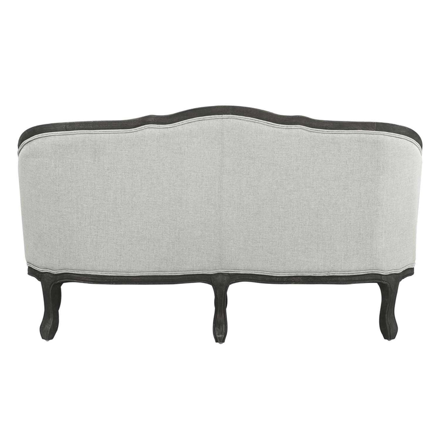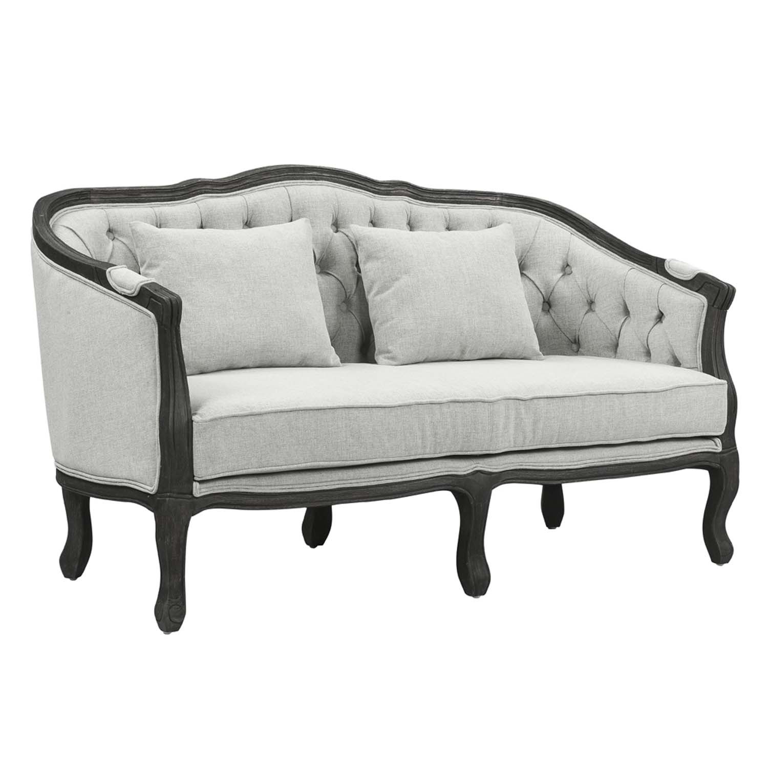With a nod to vintage French design, the Samael is a modern interpretation of a camel-back loveseat is distinguished by its exposed, and beautifully carved, wooden frame that wraps you in comfort. Its curved frame with a winding front rail sits off the floor on carved cabriole legs. Enveloped in gray-colored linen, the piece features a deep bench seat cushion