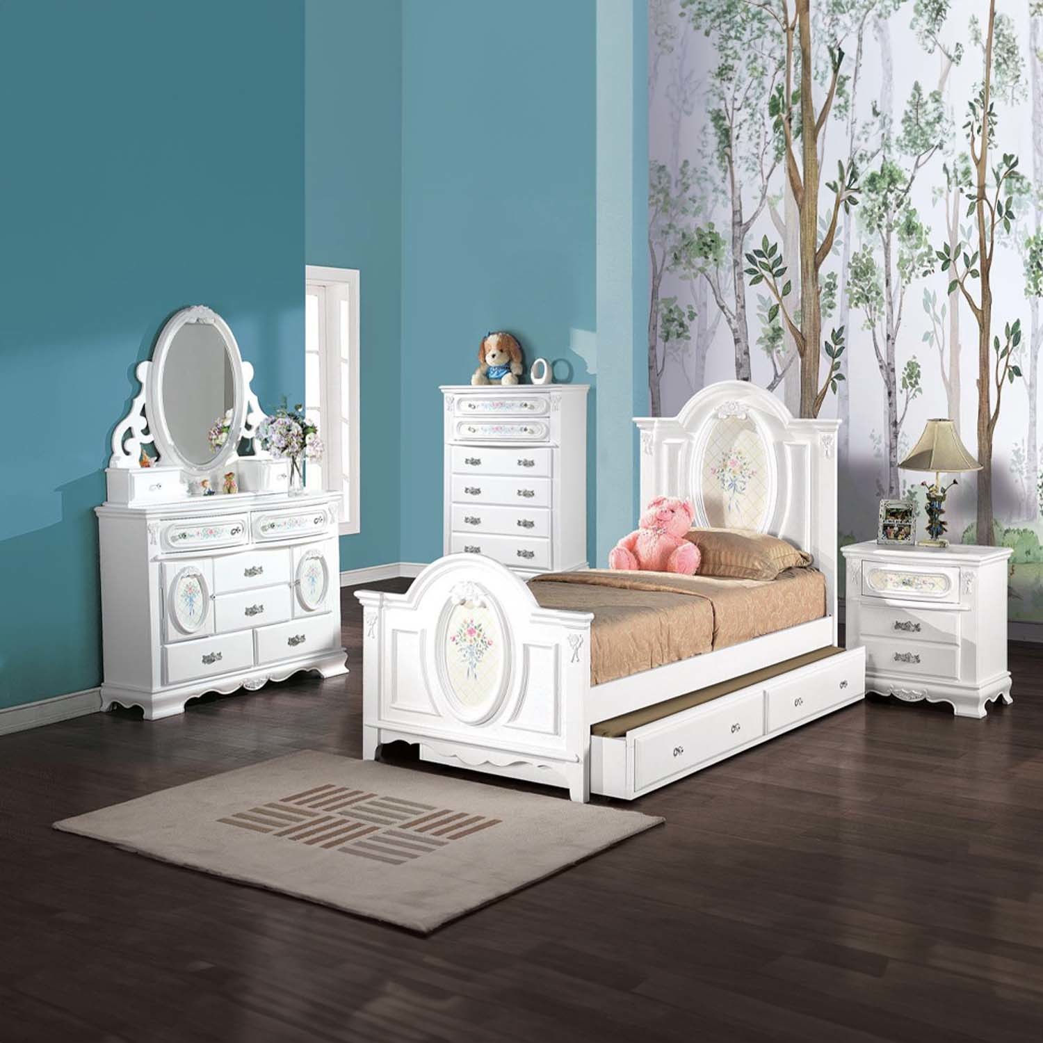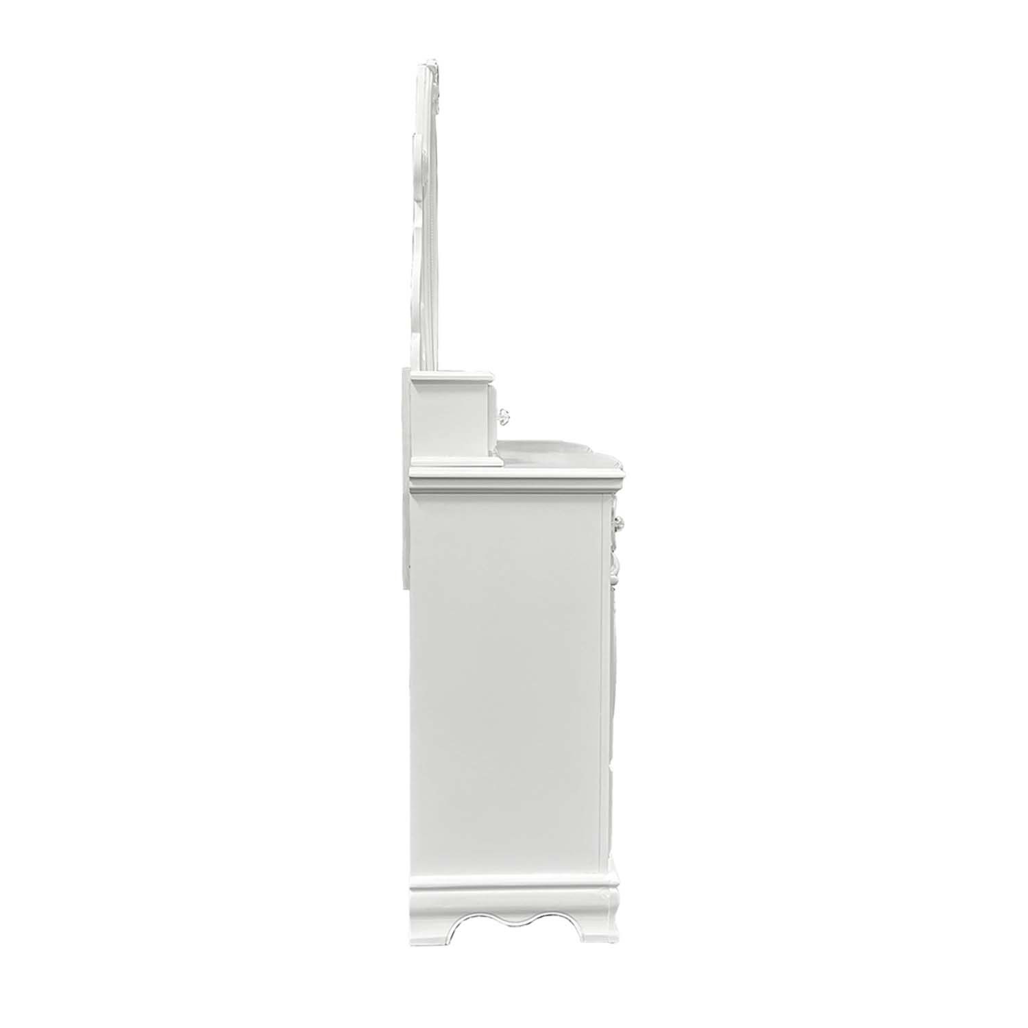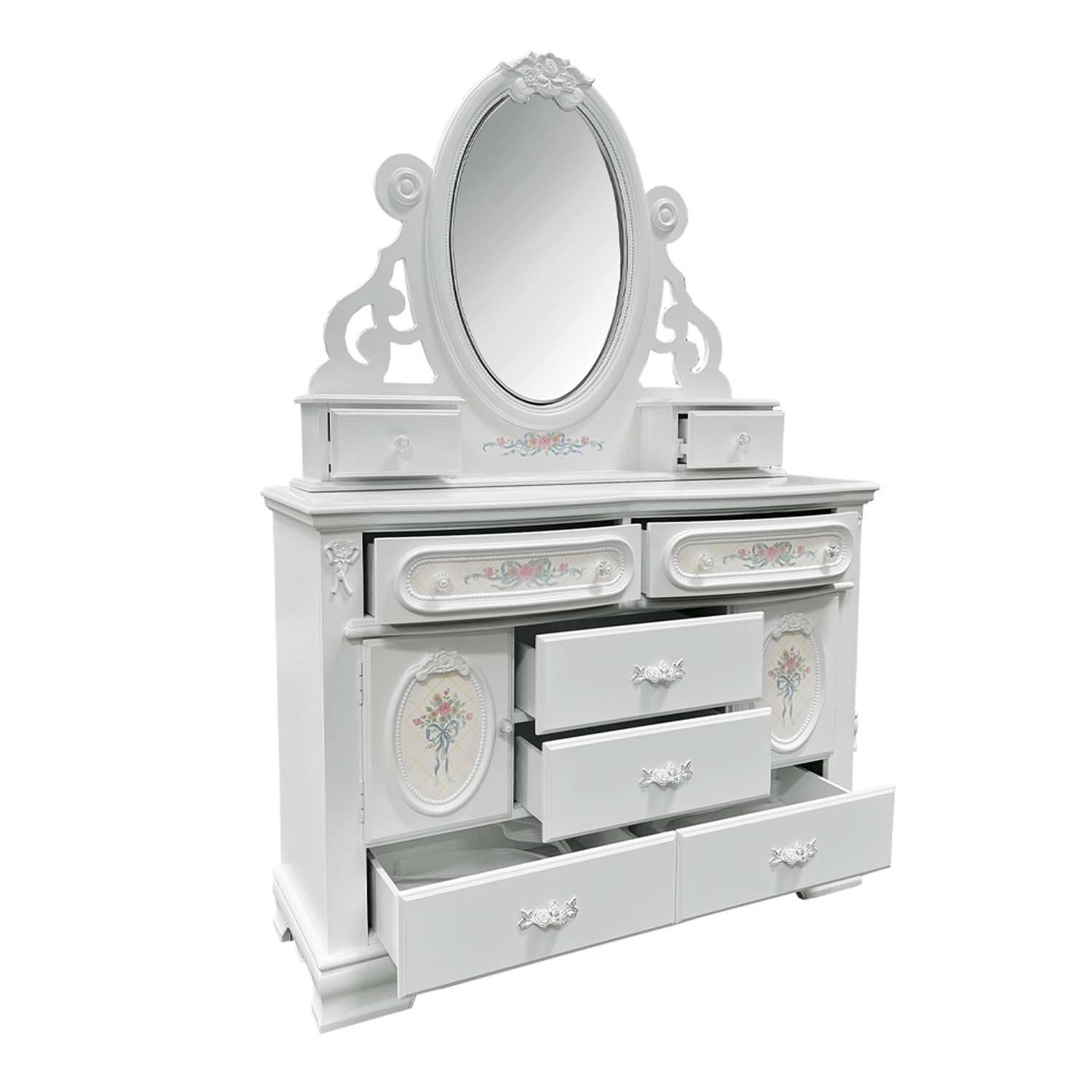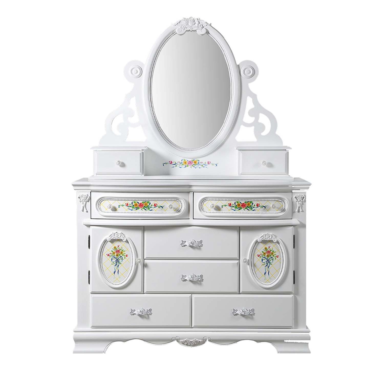 The Flora mirror features beautiful floral motif decals, rope moldings on the drawer fronts, and decorative profiled crown molding on all cases. Providing a much-needed storage solution for all your little one's princess tiaras and accessories with its two generous jewelry drawers. This beautiful Flora mirror will become your little princess's favorite piece, which will help her transform into a royal member.