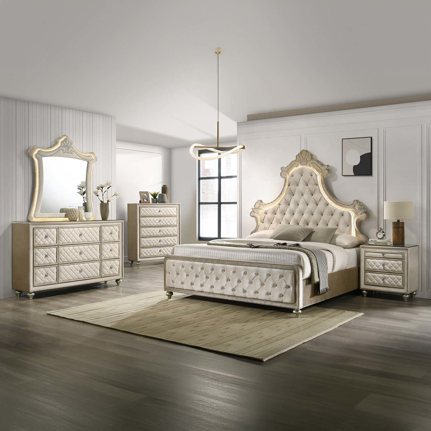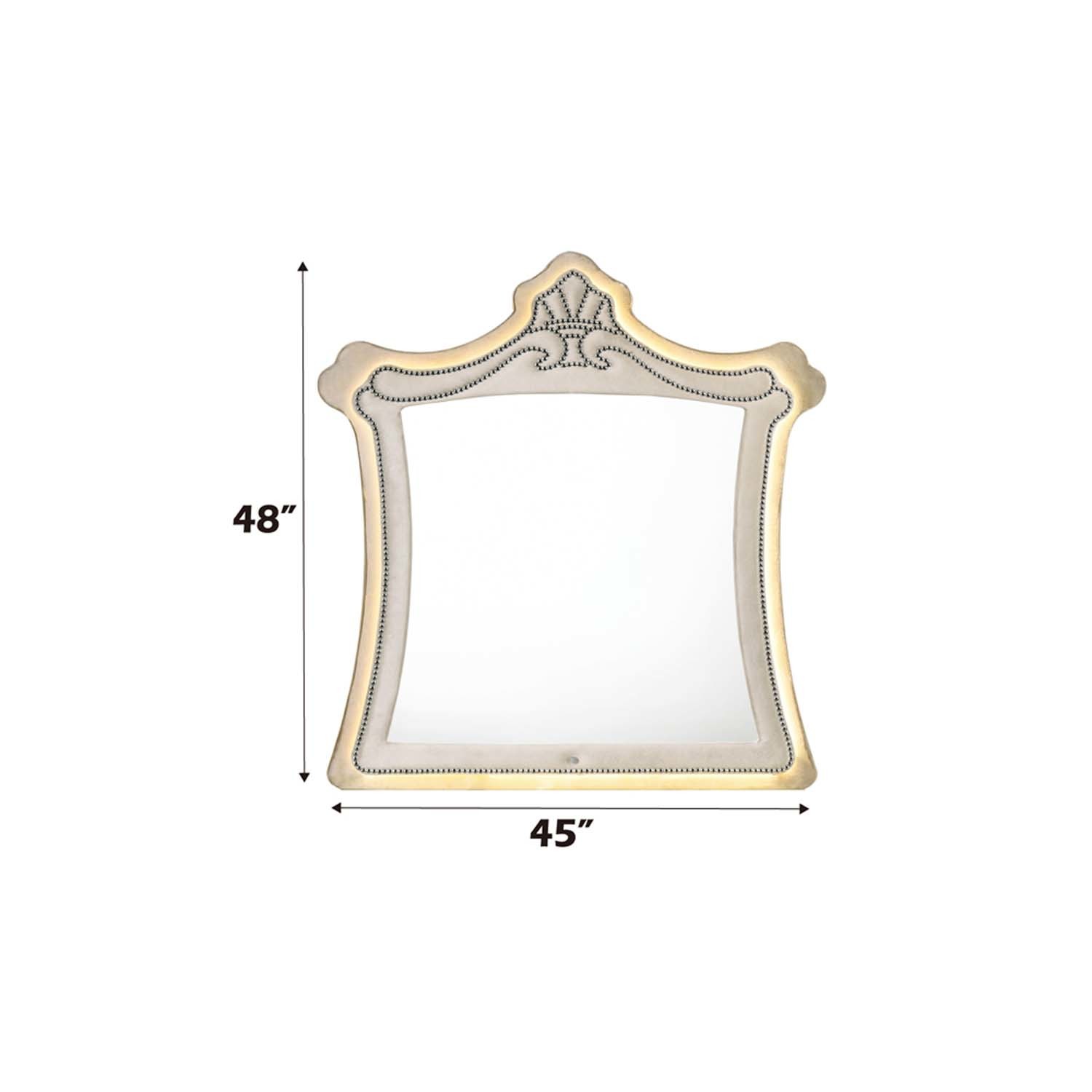 This Lucienne beige velvet upholstered wall mirror showcases a very unique and attractive design. The mirror flaunts a crown top frame with nailhead trim. The LED feature is handy when getting ready for the day, it is incorporated with mounting hardware for easiness of hanging the mirror onto the dresser. This is a must-have piece of mirror. The dresser is sold separately.