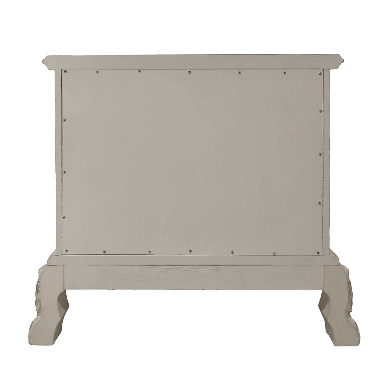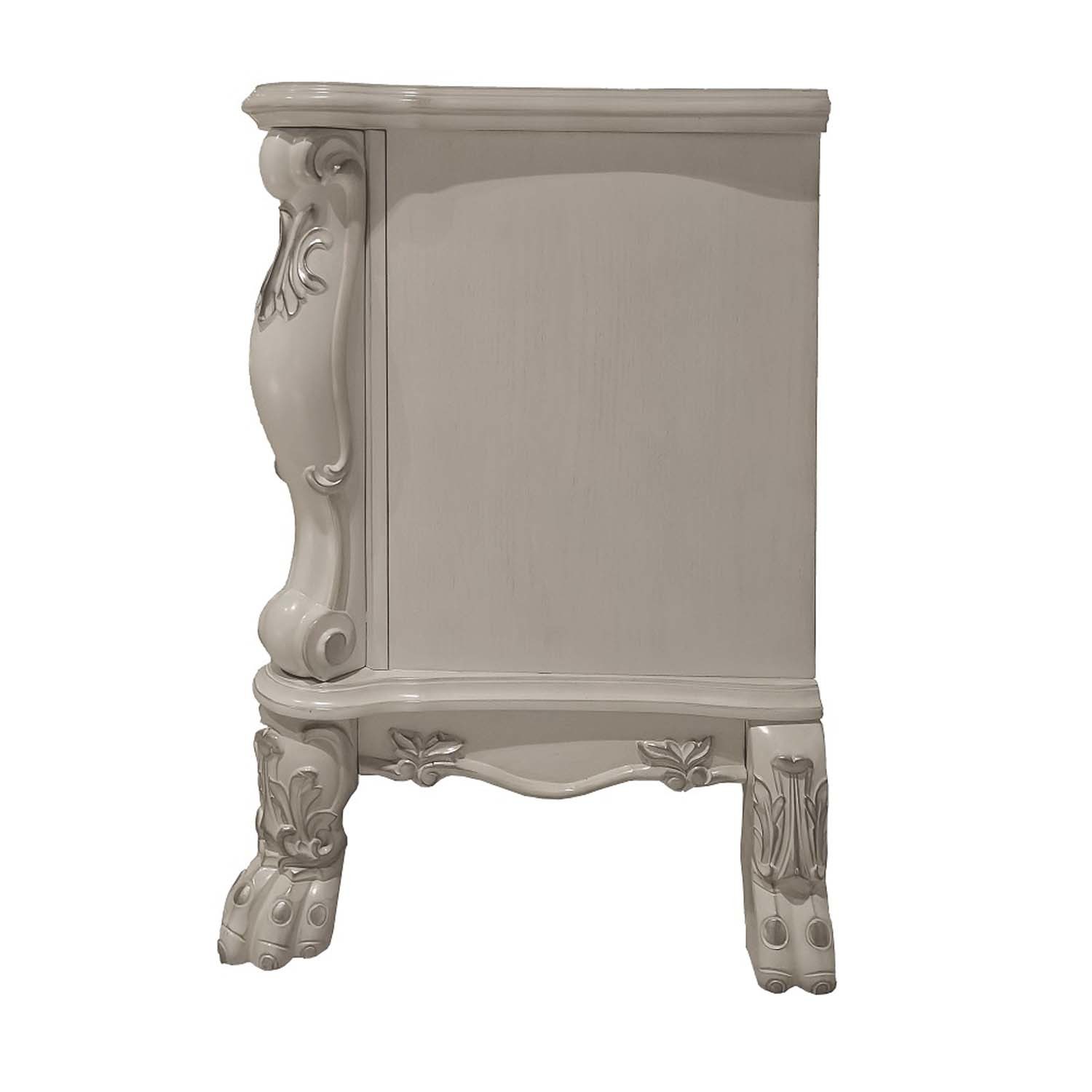 The Dresden II nightstand is exclusively designed and filled with a romantic spirit that will transport you to regal times. The piece is crafted and inspired by the luxurious designs of the past, this gorgeous piece features two drawers with French dovetail construction with felt lining. Expertly detailed, this gorgeous nightstand highlights elaborate carvings on its frame. This nightstand is finished in an elegant bone white with hand-brushed silver accents and sits on elegant claw feet.