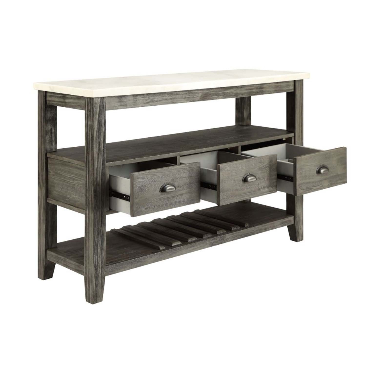 Features: Rectangular Server Storage: 3 Drawers, 2 Open Compartments (2 Fixed Shelves: Bottom Shelf with Wine Bottle Holder) Marble Top Wood Tapered Leg, Drawers Shelves: Gray Oak Finish Drawer: GLIDE Side Metal (Full Ext.), Felt Lined All Drawers, Safety Stop Included, Manual Close, Hardware: Single Cup-Pull, Metal Set Includes: One (1) Servers