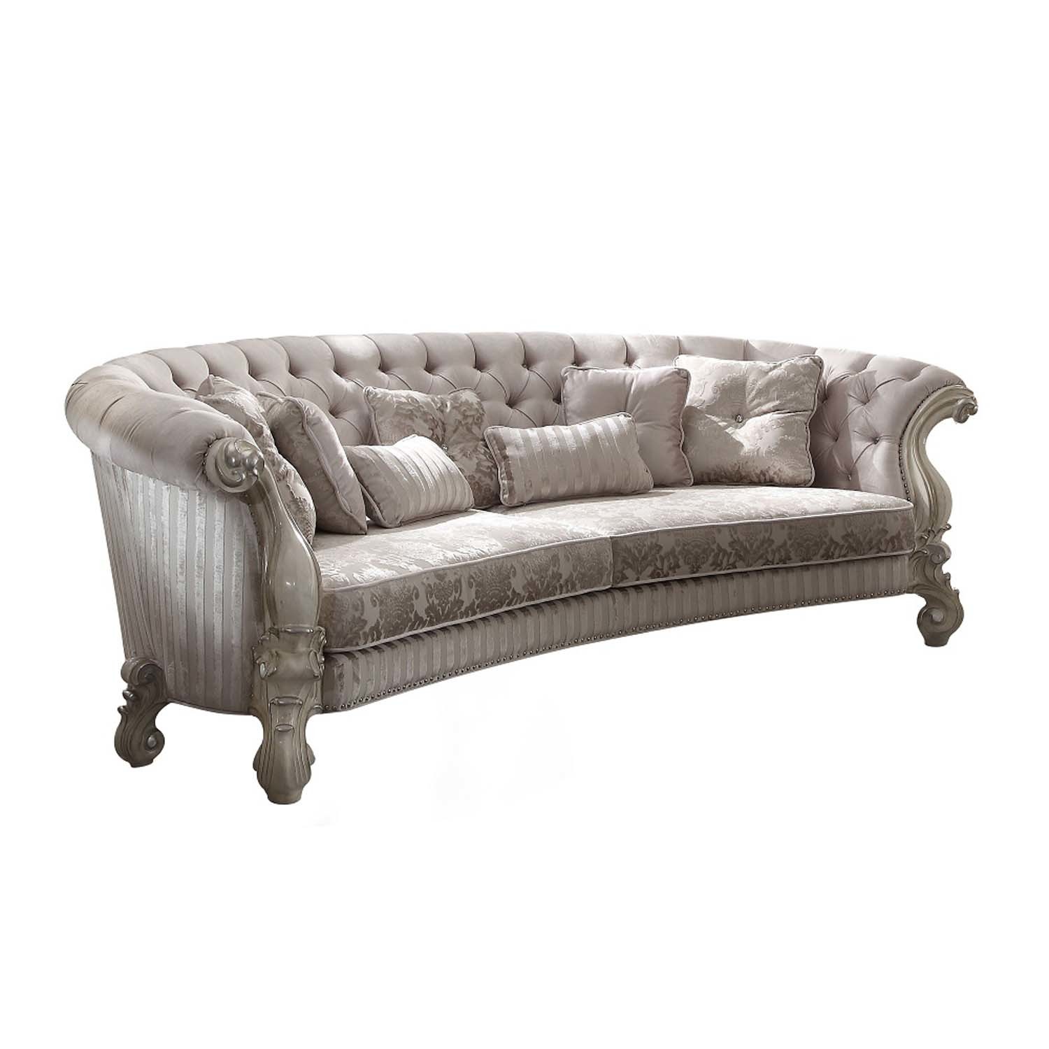 Versailles 109" Sofa w/5 Pillows, Ivory Fabric & Bone White Finish
