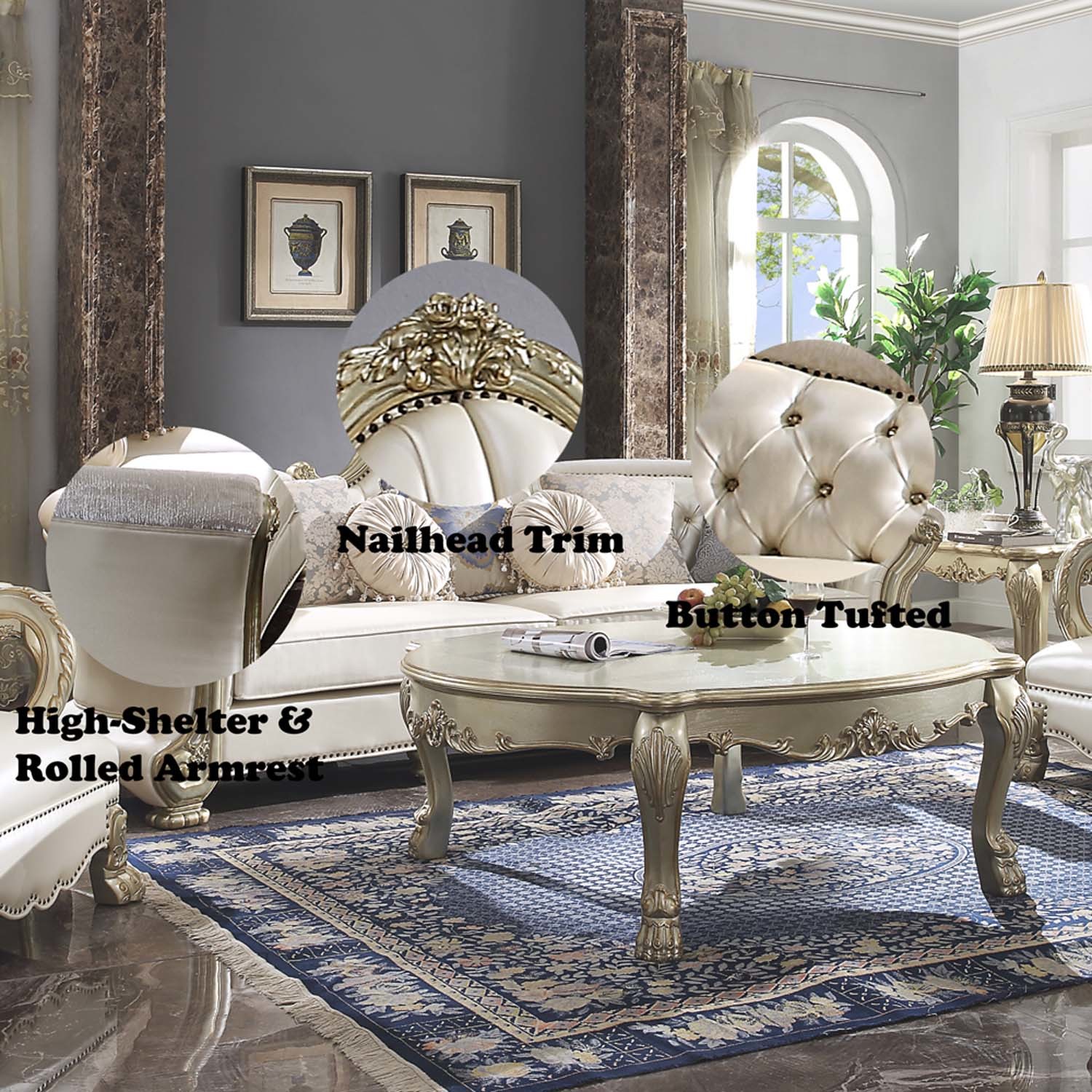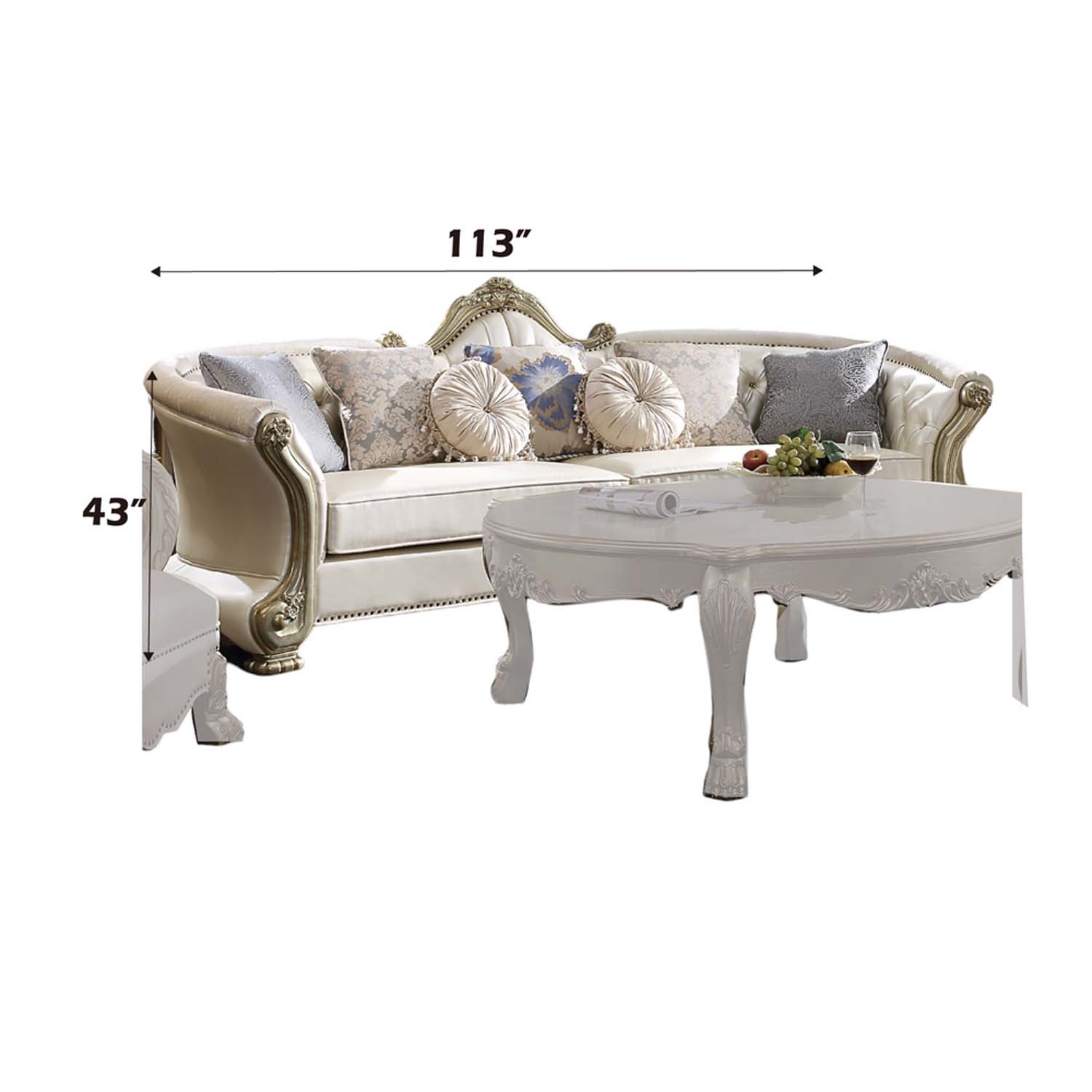 Dresden II 113" Sofa w/7 Pillows, Pearl Faux Leather & Gold Patina Finish