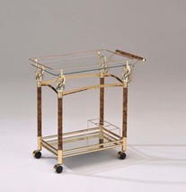 Keep your life glamorous and on the go with the Helmut Serving Cart. This rolling bar cart features a gold-plated frame that shows off its shimmering glass and mirrored shelves. The two-tier shelves create a multipurpose drink tray or nightstand with roomy shelves that will provide ample display and storage space for party spirits, bedside reading, accent items, or even small kitchen appliances. Your life rolls with the flow with this goes anywhere bar cart in a dining room, living room, or bedroom.