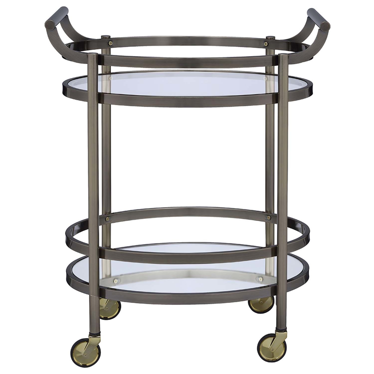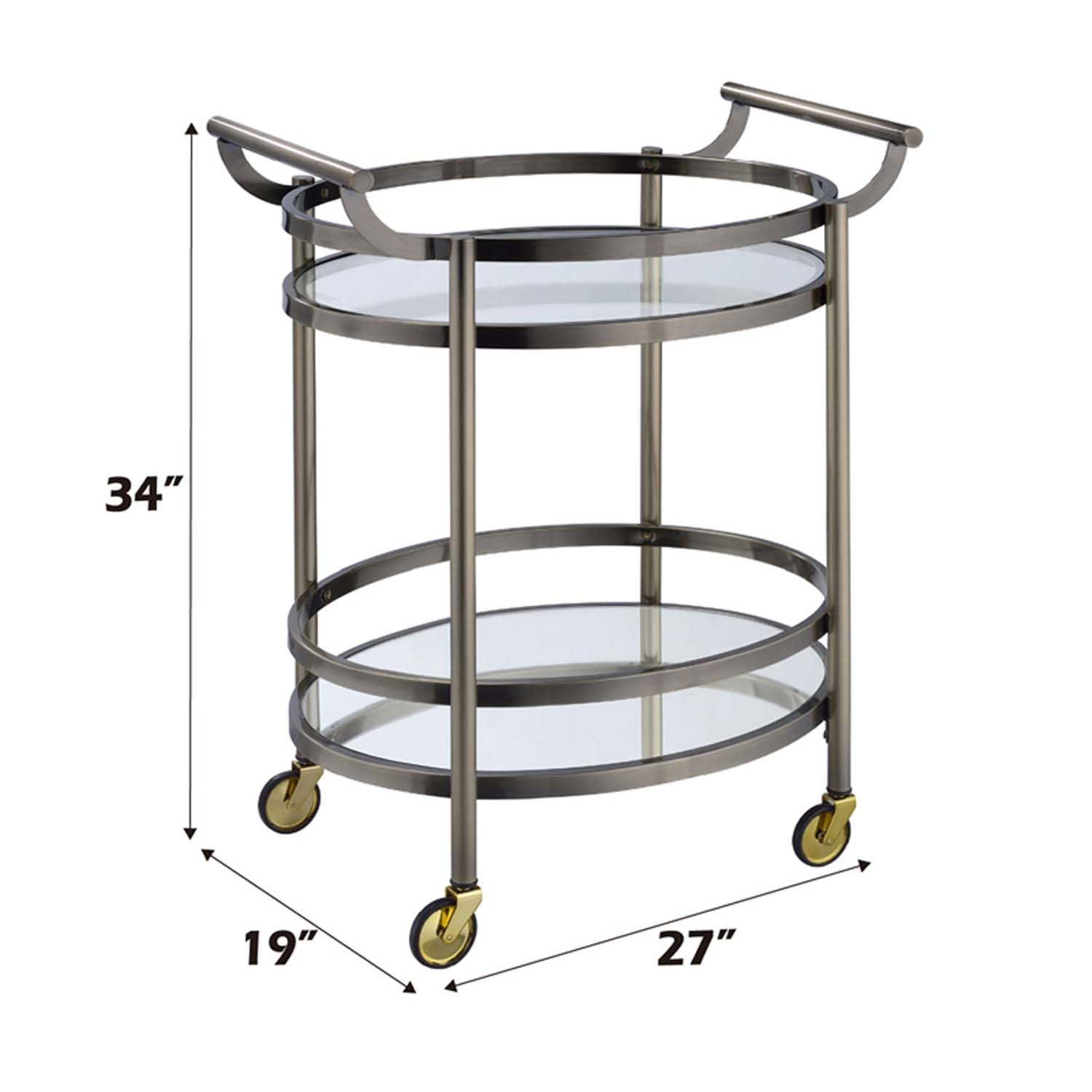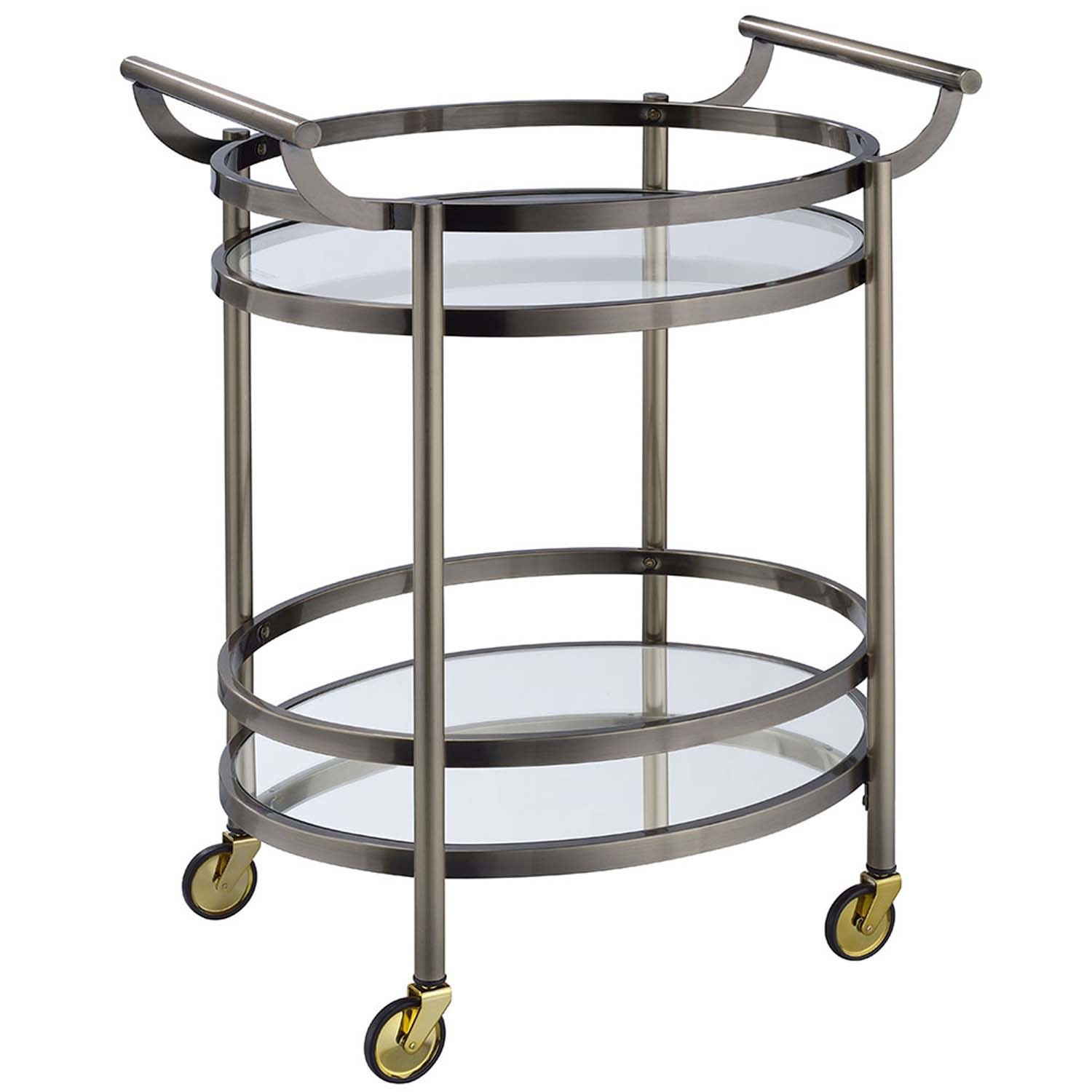 Features: Oval Serving Cart Open Storage: 2 Shelves (Top Glass, Base Mirrored) Top Shelf: 5mm Clear Tempered Glass Bottom Shelf: 5mm Mirror 3mm Hardboard Metal Frame Handles: Brushed Bronze Finish, 1.0mm x 1" round tube, 1.0mm x 13 x 26mm tube Set Includes: One (1) Serving Cart
