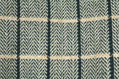 Vintage 1970s men?s jacket in a striking green herringbone plaid wool. Features brass stud snap front closure, straight hem with side vents, and an elasticized back waist that gives a belted silhouette. Fully lined in gold taffeta. A rare find with that authentic disco-era styling.