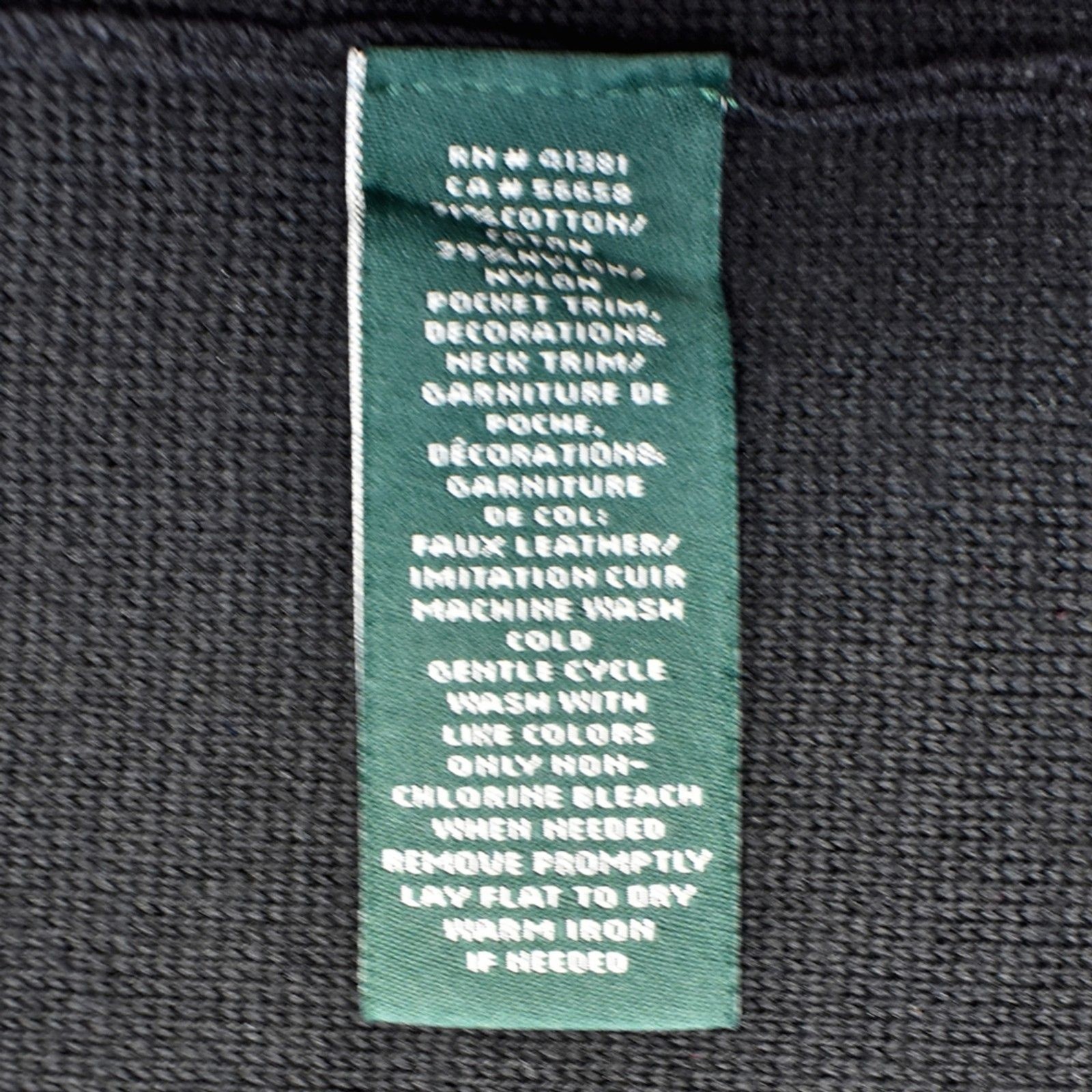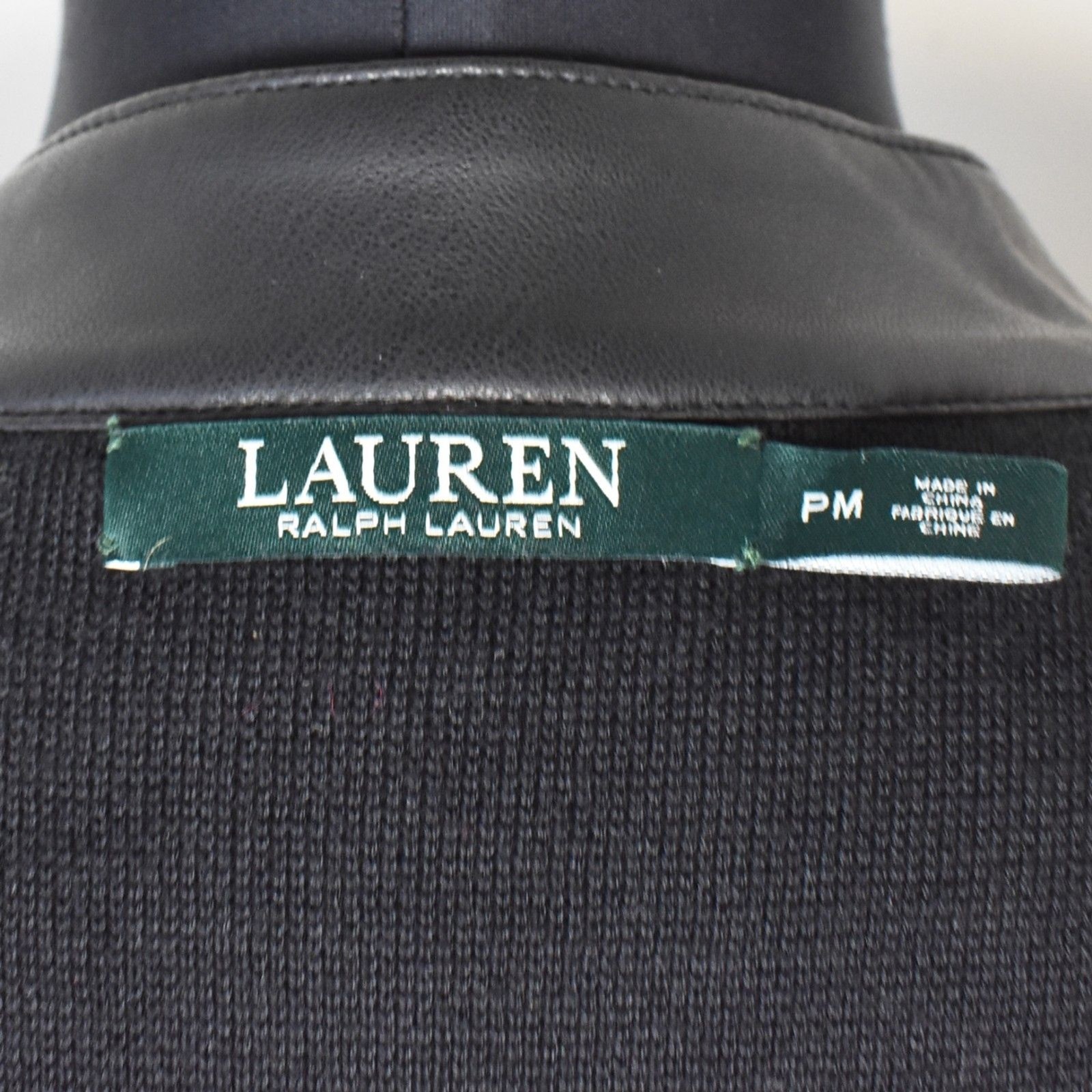 Lauren Ralph Lauren black motorcycle style jacket , women's size Petite Medium, is in excellent condition. Black cotton blend fabric with faux leather stand up snap closure collar and shoulders. Left chest and hand pockets with faux leather and zip closures. Long sleeves. Cotton/Nylon, Faux Leather Trim; Machine wash .