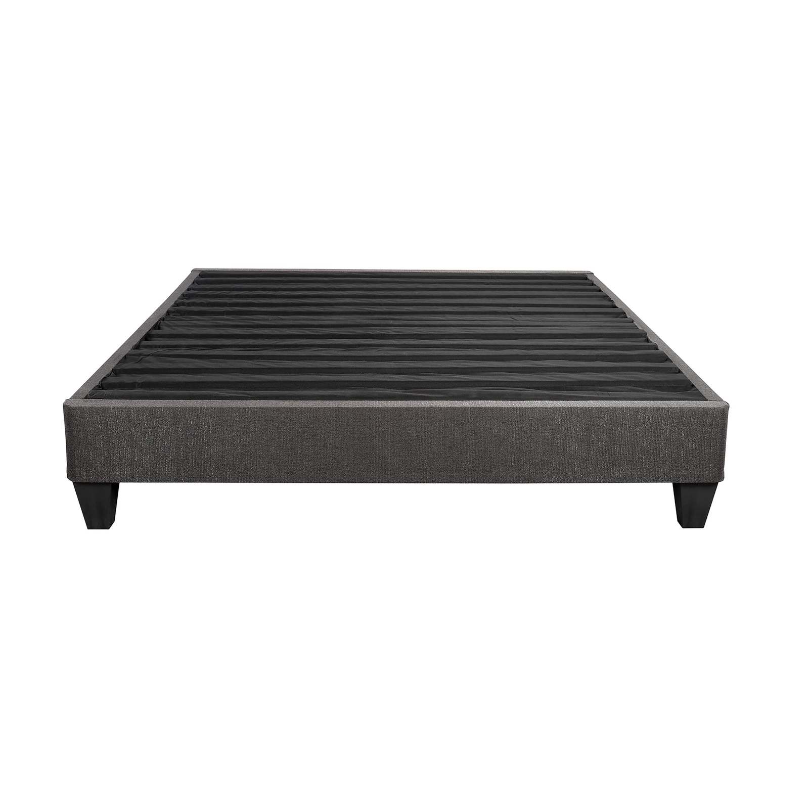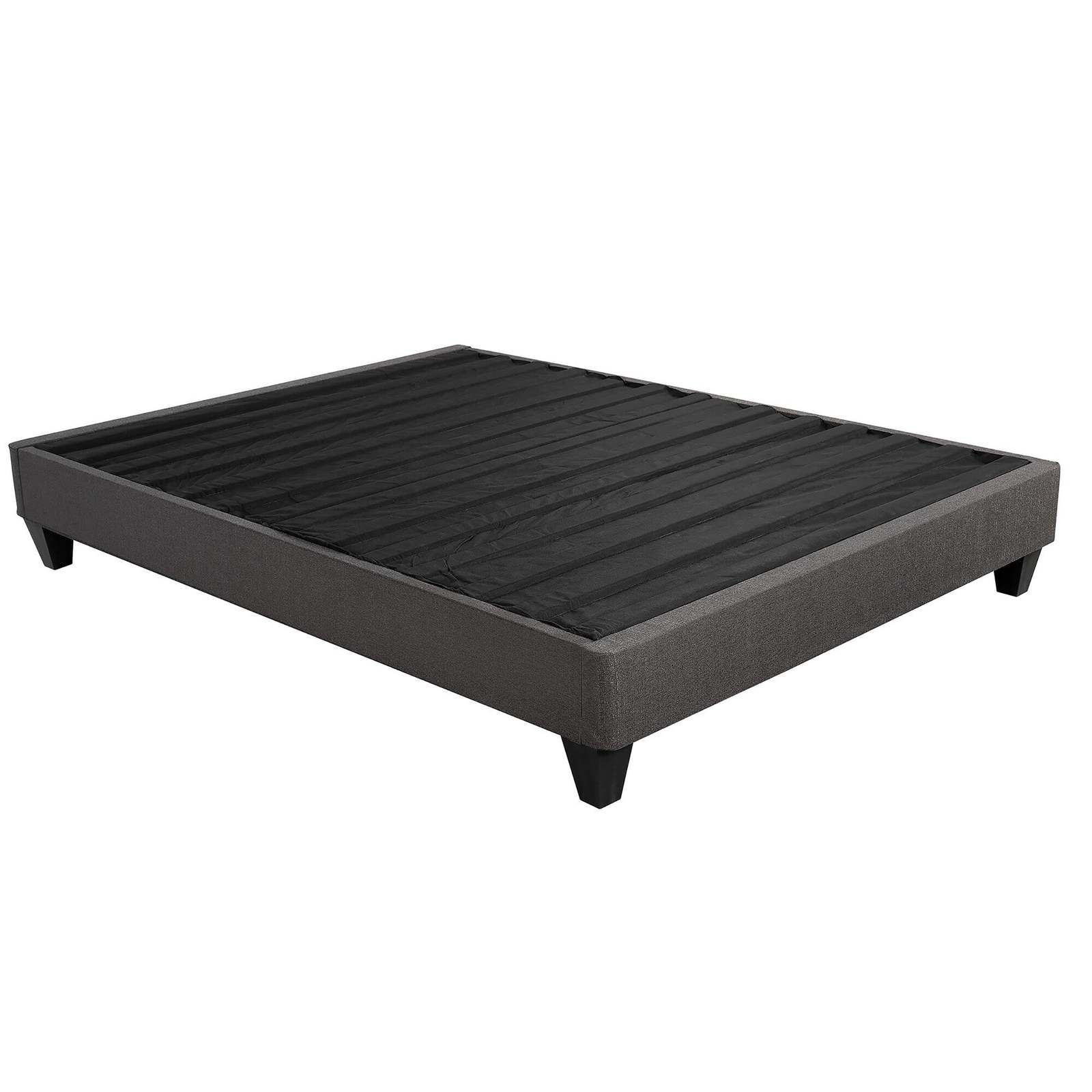 This Fabric Platform Bed Frame Base combines functionality and simplicity in a contemporary stand-alone platform bed base. Featuring a sleek design, simple wood construction and dark gray linen fabric, the Upholstered Bed Base will create the cozy bedroom you've always dreamed of. Attach your favorite headboard with the included headboard attachment kit for a complete stylish bed. This Upholstered Bed Base can be installed directly on the floor with the addition of the included legs, or on a separate bed frame for a higher profile.