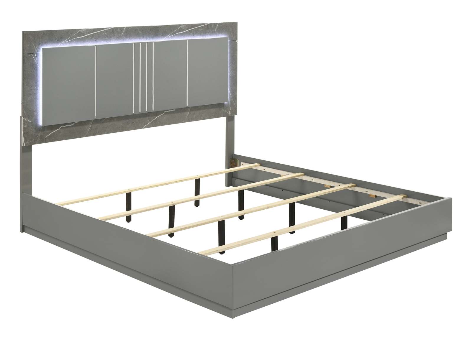 Upgrade your bedroom with the sophisticated allure of this contemporary bed, which seamlessly blends functionality with high-end design. The solid gray frame features a striking two-tone high-gloss marble and lacquer finish on the headboard, illuminated by ambient LED lighting to create a focal point that exudes modern elegance. The bed sits on sleek metal-finished legs, adding a touch of refinement to its overall aesthetic. To ensure full support and durability for your mattress, a low-profile box spring is required, complementing the beda??s sleek shape while providing necessary stability. This bed not o