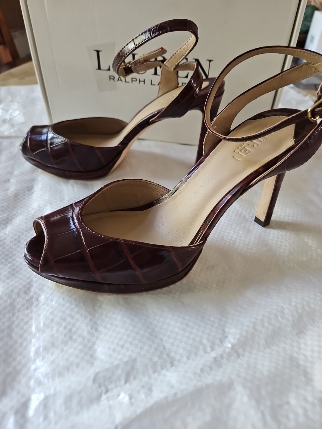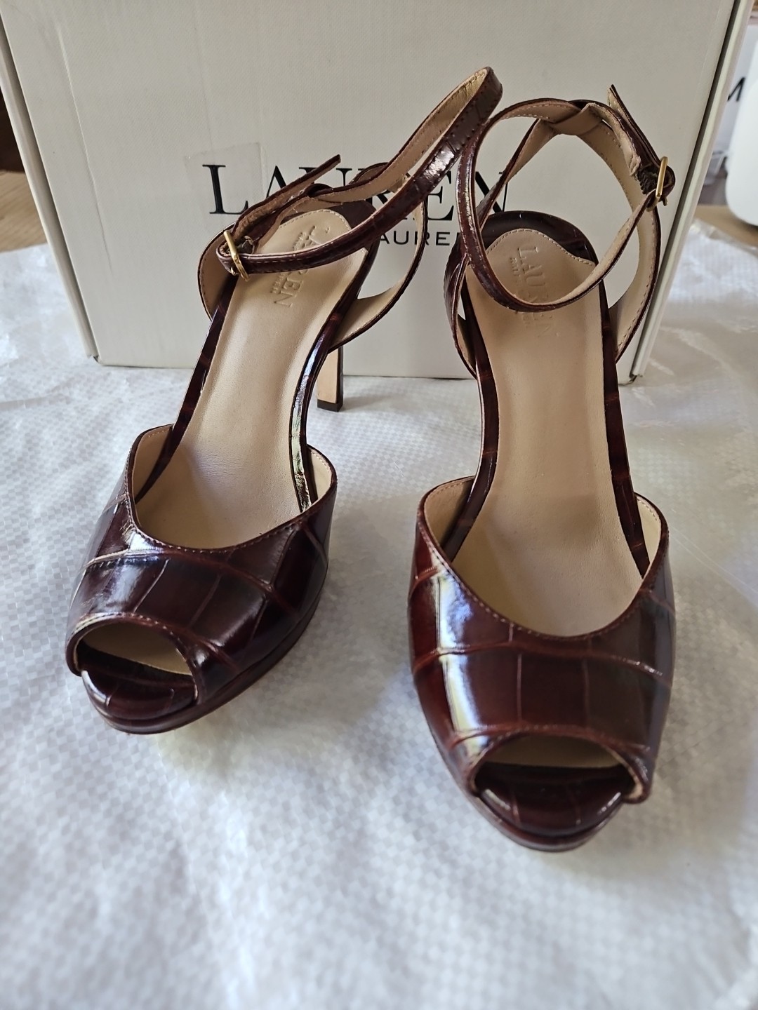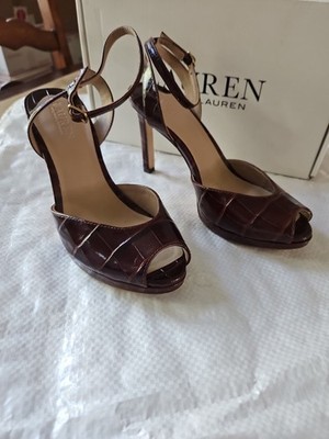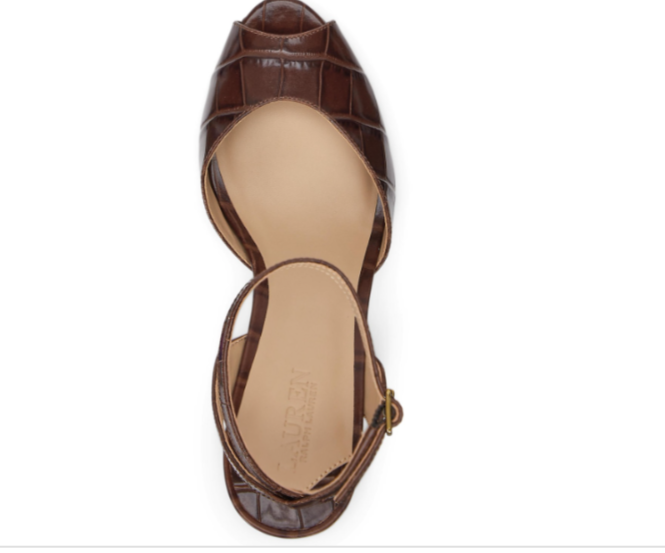 Subtle platforms and elegant ankle straps bring subtle dimension to a dressy lift with croc-embossed leather in the fresh Kyla sandals from Lauren Ralph Lauren.Features